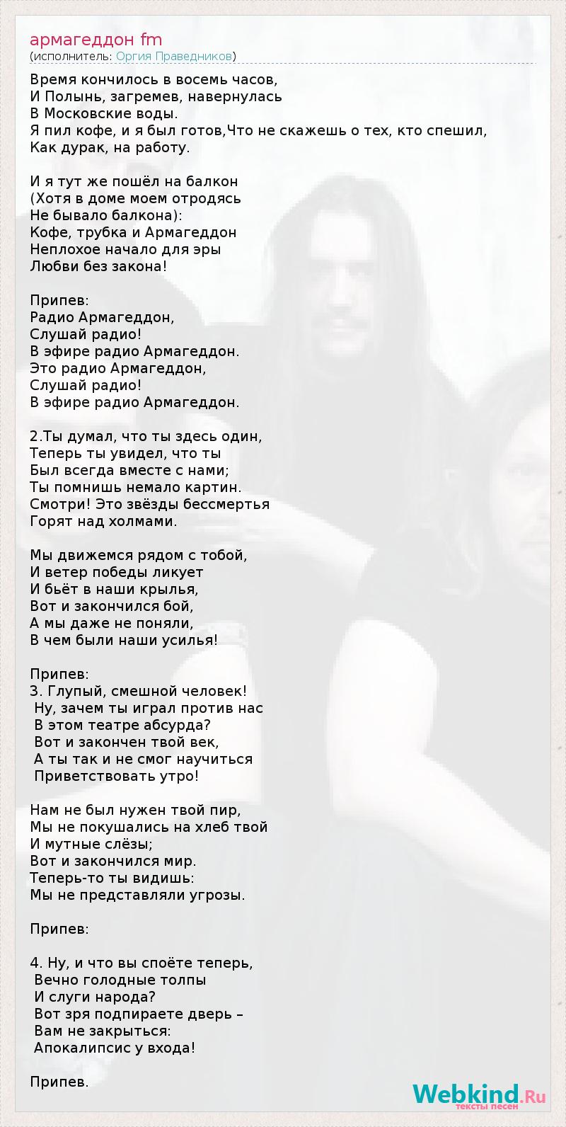 Время кончилось в восемь часов, И Полынь, загремев, навернулась В Московские воды. Я пил кофе, и я был готов,Что не скажешь о тех, кто спешил, Как дурак, на работу. И я тут же пошёл на балкон (Хотя в доме моем отродясь Не бывало балкона): Кофе, трубка и Армагеддон Неплохое начало для эры Любви без закона! Припев: Радио Армагеддон, Слушай радио! В эфире радио Армагеддон. Это радио Армагеддон, Слушай радио! В эфире радио Армагеддон. 2.Ты думал, что ты здесь один, Теперь ты увидел, что ты Был всегда вместе с нами; Ты помнишь немало картин. Смотри! Это звёзды бессмертья Горят над холмами. Мы движемся рядом с тобой, И ветер победы ликует И бьёт в наши крылья, Вот и закончился бой, А мы даже не поняли, В чем были наши усилья! Припев: 3. Глупый, смешной человек! Ну, зачем ты играл против нас В этом театре абсурда? Вот и закончен твой век, А ты так и не смог научиться Приветствовать утро! Нам не был нужен твой пир, Мы не покушались на хлеб твой И мутные слёзы; Вот и закончился мир. Теперь-то ты видишь: Мы не представляли угрозы. Припев: 4. Ну, и что вы споёте теперь, Вечно голодные толпы И слуги народа? Вот зря подпираете дверь – Вам не закрыться: Апокалипсис у входа! Припев.