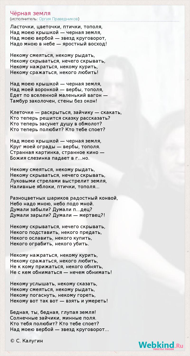 Ласточки, цветочки, птички, тополя, Над моею крышкой — черная земля, Над моею вербой — звезд круговорот, Надо мною в небе — яростный восход! Некому смеяться, некому рыдать, Некому скрываться, нечего скрывать, Некому нажраться, некому курить, Некому сражаться, некого любить! Над моею крышкой — черная земля, Над моей воронкой — вербы, тополя, Едет по вселенной маленький вагон — Тамбур заколочен, стены без окон! Клеточке — раскрыться, зайчику — скакать, Кто теперь решится сказку рассказать? Кто теперь засунет душу в обмолот? Кто теперь полюбит? Кто тебе споет? Над моею крышкой — черная земля, Круг моей ограды — вербы, тополя. Странная картинка, странное кино — Божия слезинка падает в г...но. Некому смеяться, некому рыдать, Некому скрываться, нечего скрывать, Луковыми стрелами выстрелит земля, Наливные яблоки, птички, тополя... Разноцветных шариков радостный конвой, Небо надо мною, небо подо мной. Думали забыли? Думали п...дец? Думали зарыли? Думали — мертвец?! Некому скрываться, нечего скрывать, Некого подставить, некого предать, Некого ославить, некого купить, Некого ограбить, некого убить. Некому нажраться, некому курить, Некому сражаться, некого любить, Не к кому прижаться, некого обнять, Не с кем обниматься — нечем обнимать! Некому услышать, некому сказать, Некому смеяться, некому рыдать, Некому погаснуть, некому гореть, Некому вот так вот — взять и умереть! Бедная, ты, бедная, глупая земля! Солнечные зайчики, минные поля. Кто тебя полюбит? Кто тебе споет? Над моею вербой — звезд круговорот... © С. Калугин