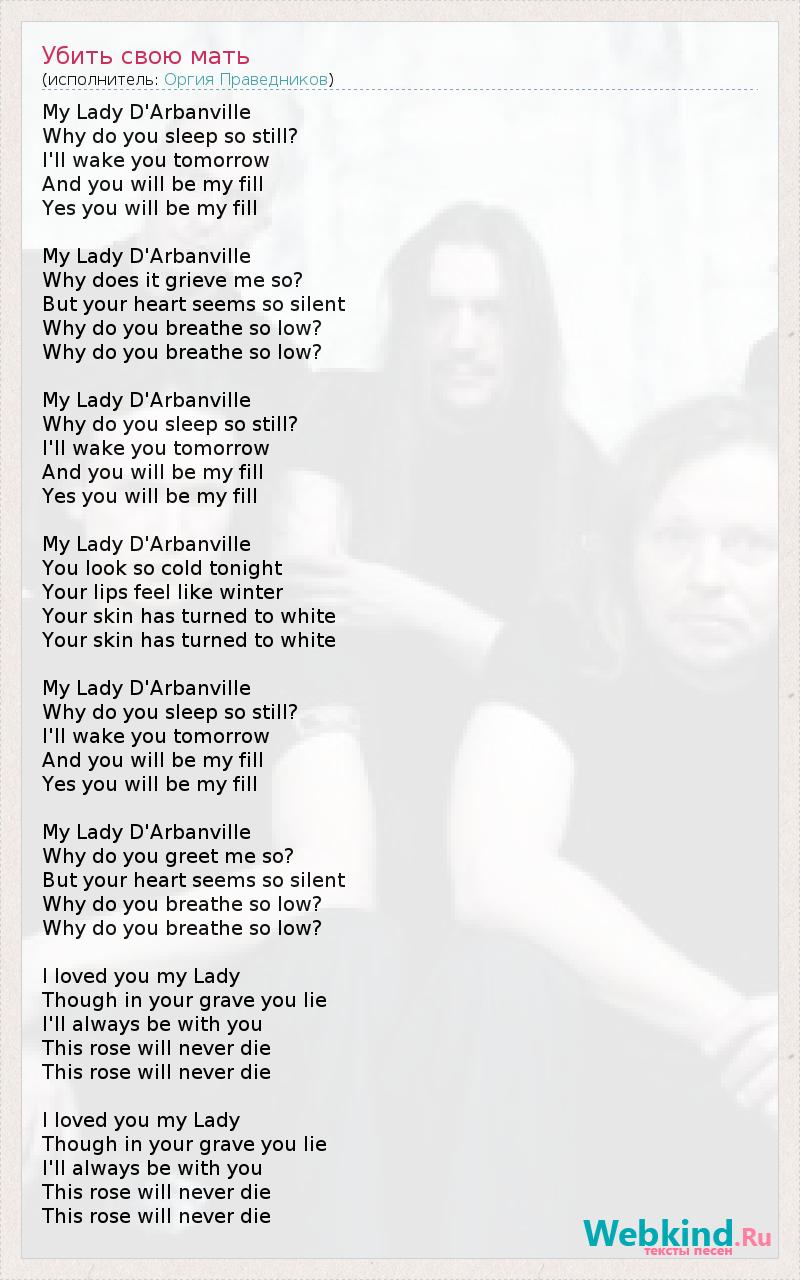 Миледи D'Arbanville Почему вы спите так еще? Я разбужу тебя завтра И вы будете моя заполнения Да, вы будете моим заполнения Миледи D'Arbanville Почему это так горевал? Но ваше сердце, кажется, так тихо, Почему вы дышите так низко? Почему вы дышите так низко? Миледи D'Arbanville Почему вы спите так еще? Я разбужу тебя завтра И вы будете моя заполнения Да, вы будете моим заполнения Миледи D'Arbanville Вы смотрите так холодно, сегодня Твои губы, как зимой чувствовать себя Ваша кожа превратилась в белый Ваша кожа превратилась в белый Миледи D'Arbanville Почему вы спите так еще? Я разбужу тебя завтра И вы будете моя заполнения Да, вы будете моим заполнения Миледи D'Arbanville Почему вы приветствуете меня так? Но ваше сердце, кажется, так тихо, Почему вы дышите так низко? Почему вы дышите так низко? Я вас любил миледи Хотя в могиле ты лежишь я всегда буду с тобой Эта роза никогда не умрет Эта роза никогда не умрет Я вас любил миледи Хотя в могиле ты лежишь я всегда буду с тобой Эта роза никогда не умрет Эта роза никогда не умрет