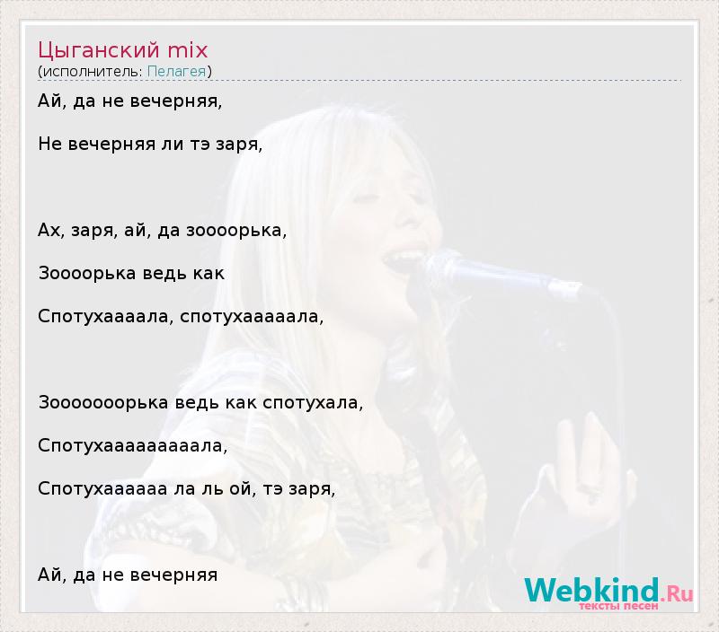 Ай, да не вечерняя, Не вечерняя ли тэ заря, Ах, заря, ай, да зоооорька, Зоооорька ведь как Спотухаааала, спотухааааала, Зооооооорька ведь как спотухала, Спотухааааааааала, Спотухаааааа ла ль ой, тэ заря, Ай, да не вечерняя