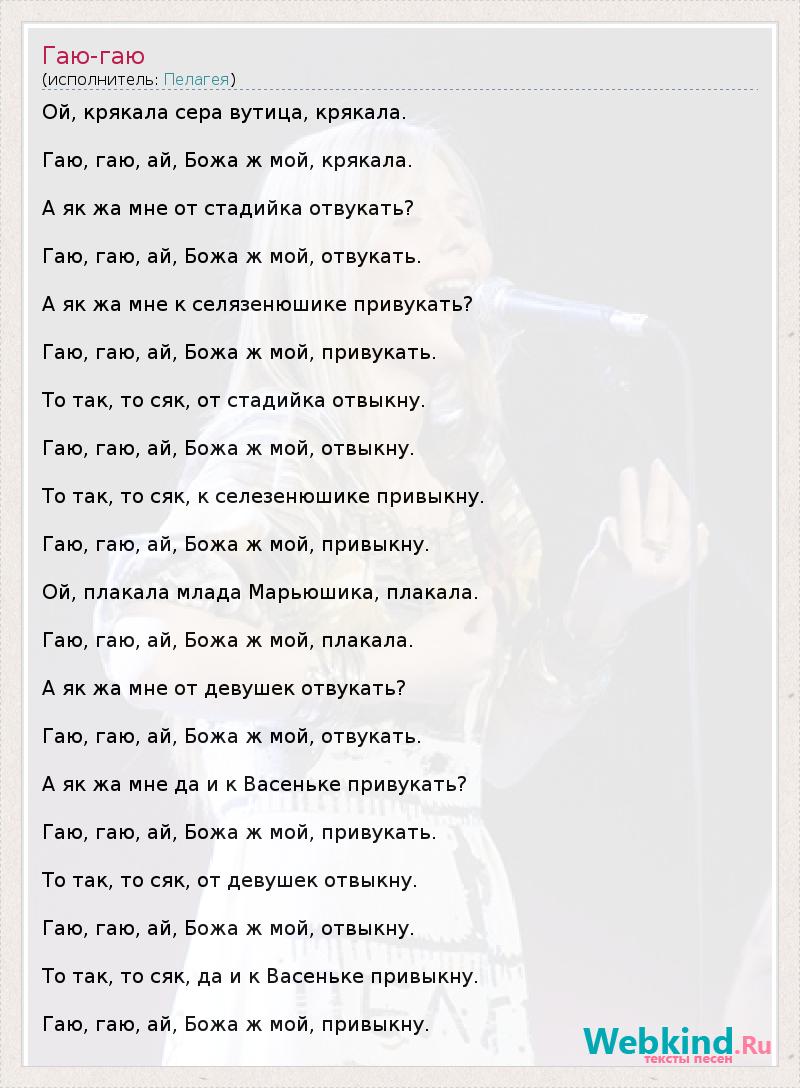Ой, крякала сера вутица, крякала. Гаю, гаю, ай, Божа ж мой, крякала. А як жа мне от стадийка отвукать? Гаю, гаю, ай, Божа ж мой, отвукать. А як жа мне к селязенюшике привукать? Гаю, гаю, ай, Божа ж мой, привукать. То так, то сяк, от стадийка отвыкну. Гаю, гаю, ай, Божа ж мой, отвыкну. То так, то сяк, к селезенюшике привыкну. Гаю, гаю, ай, Божа ж мой, привыкну. Ой, плакала млада Марьюшика, плакала. Гаю, гаю, ай, Божа ж мой, плакала. А як жа мне от девушек отвукать? Гаю, гаю, ай, Божа ж мой, отвукать. А як жа мне да и к Васеньке привукать? Гаю, гаю, ай, Божа ж мой, привукать. То так, то сяк, от девушек отвыкну. Гаю, гаю, ай, Божа ж мой, отвыкну. То так, то сяк, да и к Васеньке привыкну. Гаю, гаю, ай, Божа ж мой, привыкну.