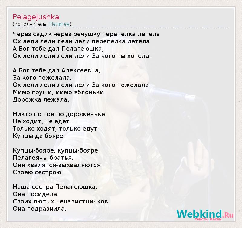 Через садик через речушку перепелка летела Ох лели лели лели лели перепелка летела А Бог тебе дал Пелагеюшка, Ох лели лели лели лели За кого ты хотела. А Бог тебе дал Алексеевна, За кого пожелала. Ох лели лели лели лели За кого пожелала Мимо груши, мимо яблоньки Дорожка лежала, Никто по той по дороженьке Не ходит, не едет. Только ходят, только едут Купцы да бояре. Купцы-бояре, купцы-бояре, Пелагеяны братья. Они хвалятся-выхваляются Своею сестрою. Наша сестра Пелагеюшка, Она посидела. Своих лютых ненавистничков Она подразнила.