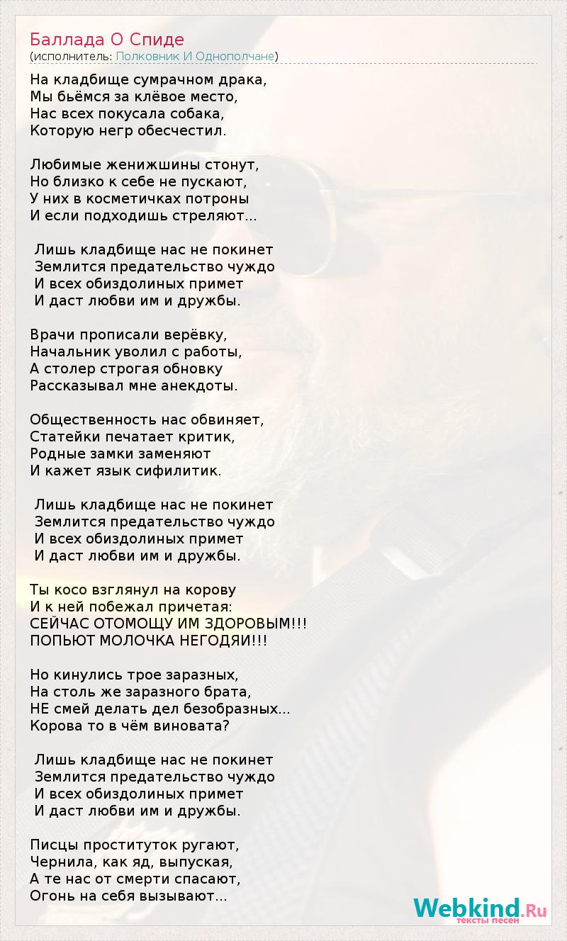 На кладбище сумрачном драка, Мы бьёмся за клёвое место, Нас всех покусала собака, Которую негр обесчестил. Любимые женижшины стонут, Но близко к себе не пускают, У них в косметичках потроны И если подходишь стреляют... Лишь кладбище нас не покинет Землится предательство чуждо И всех обиздолиных примет И даст любви им и дружбы. Врачи прописали верёвку, Начальник уволил с работы, А столер строгая обновку Рассказывал мне анекдоты. Общественность нас обвиняет, Статейки печатает критик, Родные замки заменяют И кажет язык сифилитик. Лишь кладбище нас не покинет Землится предательство чуждо И всех обиздолиных примет И даст любви им и дружбы. Ты косо взглянул на корову И к ней побежал причетая: СЕЙЧАС ОТОМОЩУ ИМ ЗДОРОВЫМ!!! ПОПЬЮТ МОЛОЧКА НЕГОДЯИ!!! Но кинулись трое заразных, На столь же заразного брата, НЕ смей делать дел безобразных... Корова то в чём виновата? Лишь кладбище нас не покинет Землится предательство чуждо И всех обиздолиных примет И даст любви им и дружбы. Писцы проституток ругают, Чернила, как яд, выпуская, А те нас от смерти спасают, Огонь на себя вызывают...