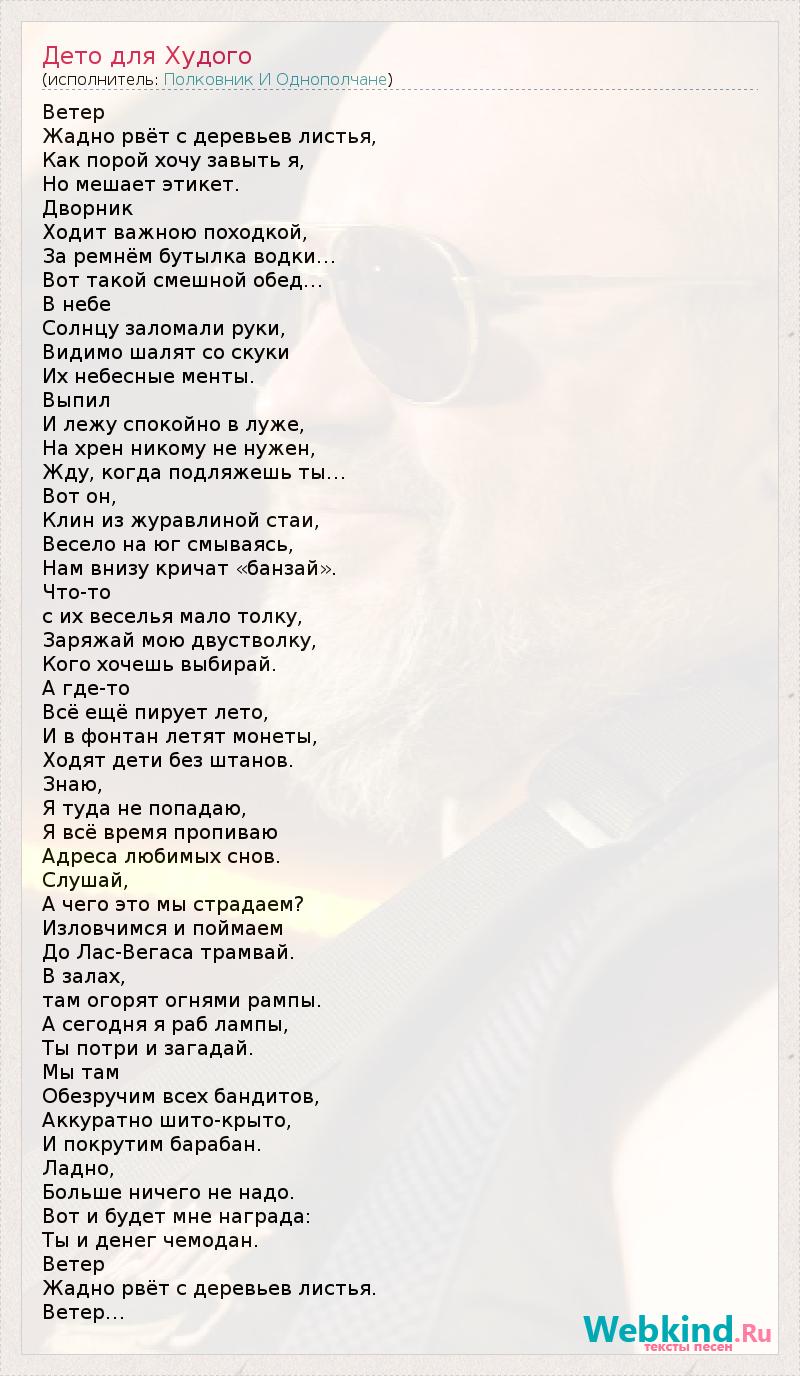 Ветер Жадно рвёт с деревьев листья, Как порой хочу завыть я, Но мешает этикет. Дворник Ходит важною походкой, За ремнём бутылка водки… Вот такой смешной обед… В небе Солнцу заломали руки, Видимо шалят со скуки Их небесные менты. Выпил И лежу спокойно в луже, На хрен никому не нужен, Жду, когда подляжешь ты… Вот он, Клин из журавлиной стаи, Весело на юг смываясь, Нам внизу кричат «банзай». Что-то с их веселья мало толку, Заряжай мою двустволку, Кого хочешь выбирай. А где-то Всё ещё пирует лето, И в фонтан летят монеты, Ходят дети без штанов. Знаю, Я туда не попадаю, Я всё время пропиваю Адреса любимых снов. Слушай, А чего это мы страдаем? Изловчимся и поймаем До Лас-Вегаса трамвай. В залах, там огорят огнями рампы. А сегодня я раб лампы, Ты потри и загадай. Мы там Обезручим всех бандитов, Аккуратно шито-крыто, И покрутим барабан. Ладно, Больше ничего не надо. Вот и будет мне награда: Ты и денег чемодан. Ветер Жадно рвёт с деревьев листья. Ветер…