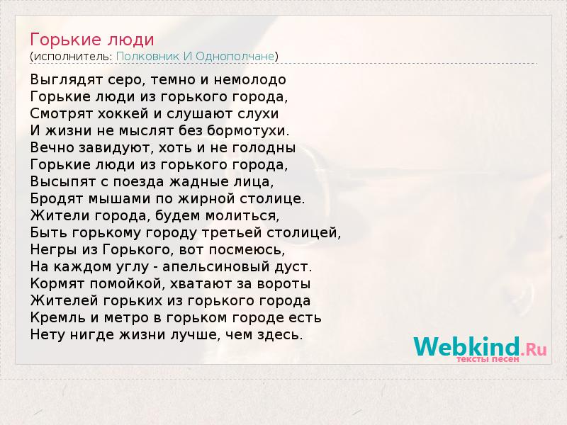 Выглядят серо, темно и немолодо Горькие люди из горького города, Смотрят хоккей и слушают слухи И жизни не мыслят без бормотухи. Вечно завидуют, хоть и не голодны Горькие люди из горького города, Высыпят с поезда жадные лица, Бродят мышами по жирной столице. Жители города, будем молиться, Быть горькому городу третьей столицей, Негры из Горького, вот посмеюсь, На каждом углу - апельсиновый дуст. Кормят помойкой, хватают за вороты Жителей горьких из горького города Кремль и метро в горьком городе есть Нету нигде жизни лучше, чем здесь.