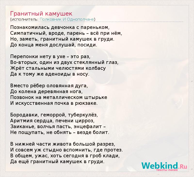 Познакомилась девчонка с пареньком, Симпатичный, вроде, парень – всё при нём, Но, заметь, гранитный камушек в груди. До конца меня дослушай, посиди. Перепонки нету в ухе – это раз, Во-вторых, один из двух стеклянный глаз, Жрёт стальными челюстями колбасу Да к тому же аденоиды в носу. Вместо рёбер оловянная дуга, До колена деревянная нога, Позвонок на металлическом штырьке И искусственная почка в рюкзаке. Бородавки, геморрой, туберкулёз, Аритмия сердца, печени цирроз, Заиканье, волчья пасть, энцефалит – Не пощупать, не обнять – везде болит. В нижней части живота большой разрез, И совсем уж стыдно вспомнить, где протез. В общем, ужас, хоть сегодня в гроб клади, Да ещё гранитный камушек в груди.