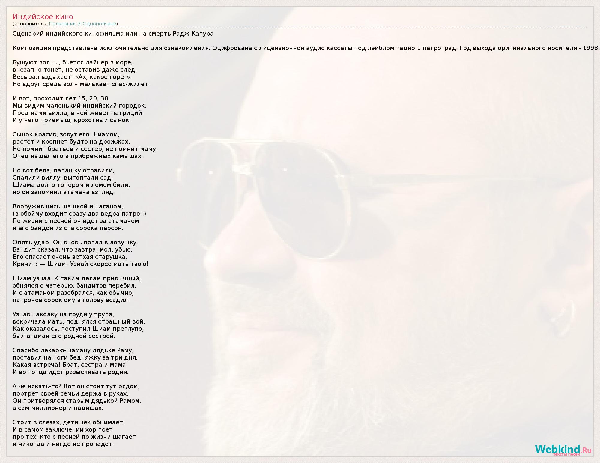 Сценарий индийского кинофильма или на смерть Радж Капура Композиция представлена исключительно для ознакомления. Оцифрована с лицензионной аудио кассеты под лэйблом Радио 1 петроград. Год выхода оригинального носителя - 1998. Бушуют волны, бьется лайнер в море, внезапно тонет, не оставив даже след. Весь зал вздыхает: «Ах, какое горе!» Но вдруг средь волн мелькает спас-жилет. И вот, проходит лет 15, 20, 30. Мы видим маленький индийский городок. Пред нами вилла, в ней живет патриций. И у него приемыш, крохотный сынок. Сынок красив, зовут его Шиамом, растет и крепнет будто на дрожжах. Не помнит братьев и сестер, не помнит маму. Отец нашел его в прибрежных камышах. Но вот беда, папашку отравили, Спалили виллу, вытоптали сад. Шиама долго топором и ломом били, но он запомнил атамана взгляд. Вооружившись шашкой и наганом, (в обойму входит сразу два ведра патрон) По жизни с песней он идет за атаманом и его бандой из ста сорока персон. Опять удар! Он вновь попал в ловушку. Бандит сказал, что завтра, мол, убью. Его спасает очень ветхая старушка, Кричит: — Шиам! Узнай скорее мать твою! Шиам узнал. К таким делам привычный, обнялся с матерью, бандитов перебил. И с атаманом разобрался, как обычно, патронов сорок ему в голову всадил. Узнав наколку на груди у трупа, вскричала мать, поднялся страшный вой. Как оказалось, поступил Шиам преглупо, был атаман его родной сестрой. Спасибо лекарю-шаману дядьке Раму, поставил на ноги бедняжку за три дня. Какая встреча! Брат, сестра и мама. И вот отца идет разыскивать родня. А чё искать-то? Вот он стоит тут рядом, портрет своей семьи держа в руках. Он притворялся старым дядькой Рамом, а сам миллионер и падишах. Стоит в слезах, детишек обнимает. И в самом заключении хор поет про тех, кто с песней по жизни шагает и никогда и нигде не пропадет.