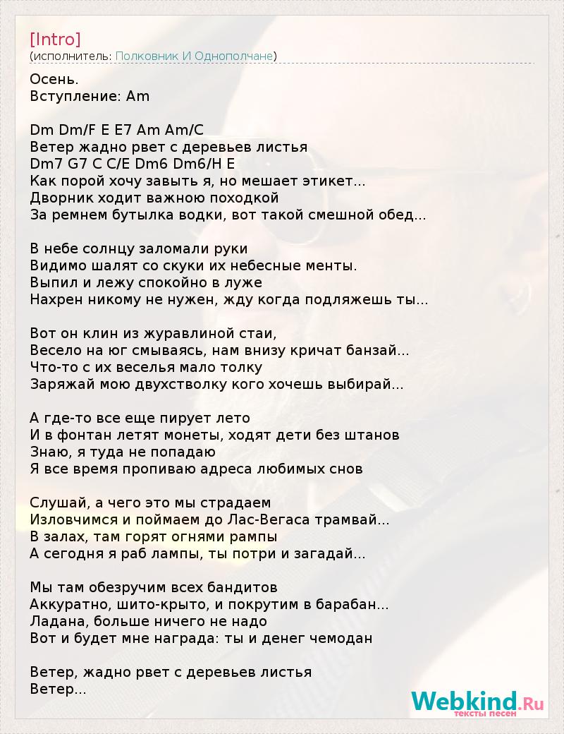 Autumn. Introduction : Am Dm Dm / F E E7 Am Am / C Wind greedily tearing trees with leaves Dm7 G7 C C / E Dm6 Dm6 / H E As sometimes I want to howl , but prevents etiquette ... Janitor goes great unto gait Belt for a bottle of vodka , that 's so funny lunch ... In the sky the sun twisted his arms Apparently naughty bored their celestial cops . Drank and lay quietly in a puddle Fuck nobody wants , waiting for you ... podlyazhesh Here he is a wedge of cranes from the pack, Fun south swabs us downstairs screaming Banzai ... Something a little fun with their sense Charge my dvuhstvolku anyone you choose ... And somewhere still feasting summer And in the fountain fly coins, children go without pants I know I do not get there I always drink away your favorite addresses dreams Hey, this is what we suffer Contrived to catch up to Las Vegas tram ... In the halls , there are burning lights ramp And today I am a slave lamps, you rub your and make a ... We were there all the bandits obezruchim Gently , hush-hush , and rotate the drum ... Incense , nothing else That will be my reward : you money and suitcase Wind greedily tearing trees with leaves Wind ...