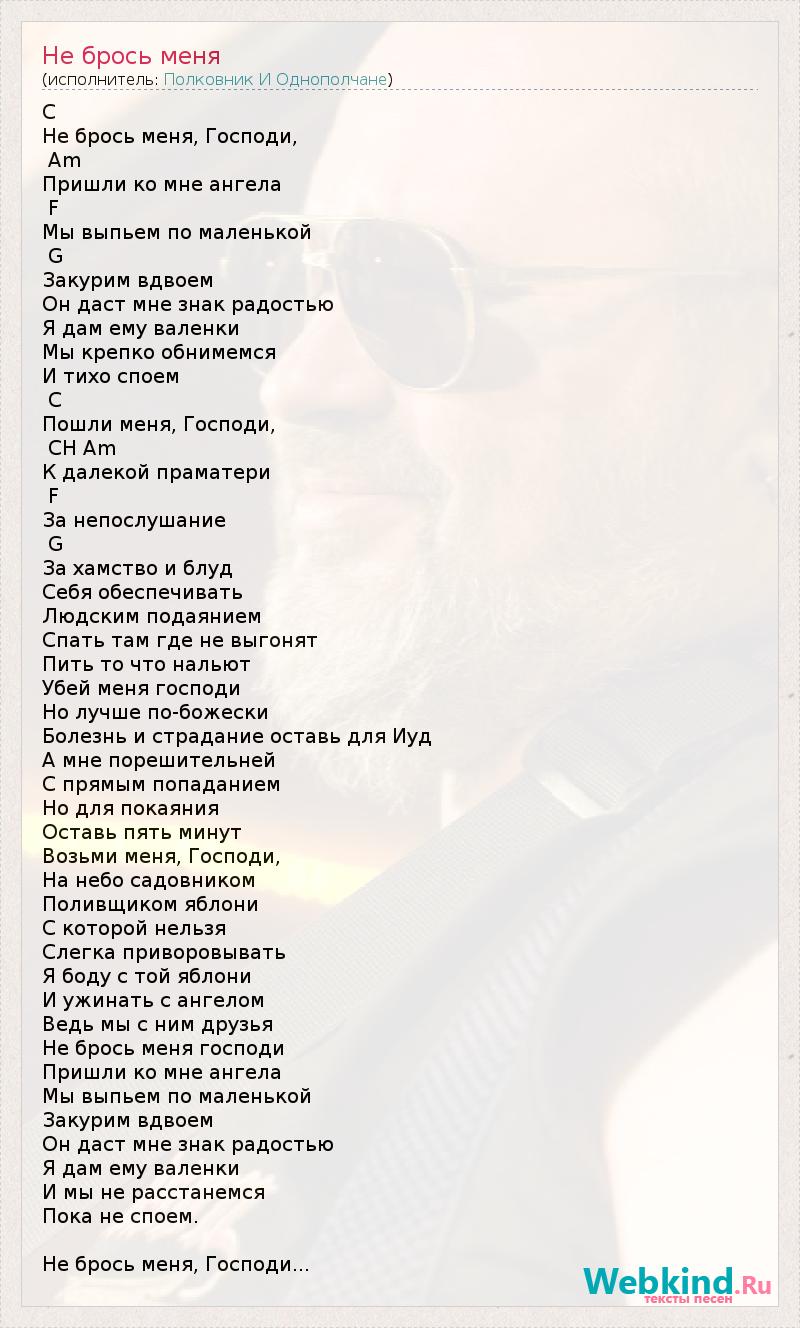 C Не брось меня, Господи, Am Пришли ко мне ангела F Мы выпьем по маленькой G Закурим вдвоем Он даст мне знак радостью Я дам ему валенки Мы крепко обнимемся И тихо споем C Пошли меня, Господи, CH Am К далекой праматери F За непослушание G За хамство и блуд Себя обеспечивать Людским подаянием Спать там где не выгонят Пить то что нальют Убей меня господи Но лучше по-божески Болезнь и страдание оставь для Иуд А мне порешительней С прямым попаданием Но для покаяния Оставь пять минут Возьми меня, Господи, На небо садовником Поливщиком яблони С которой нельзя Слегка приворовывать Я боду с той яблони И ужинать с ангелом Ведь мы с ним друзья Не брось меня господи Пришли ко мне ангела Мы выпьем по маленькой Закурим вдвоем Он даст мне знак радостью Я дам ему валенки И мы не расстанемся Пока не споем. Не брось меня, Господи...