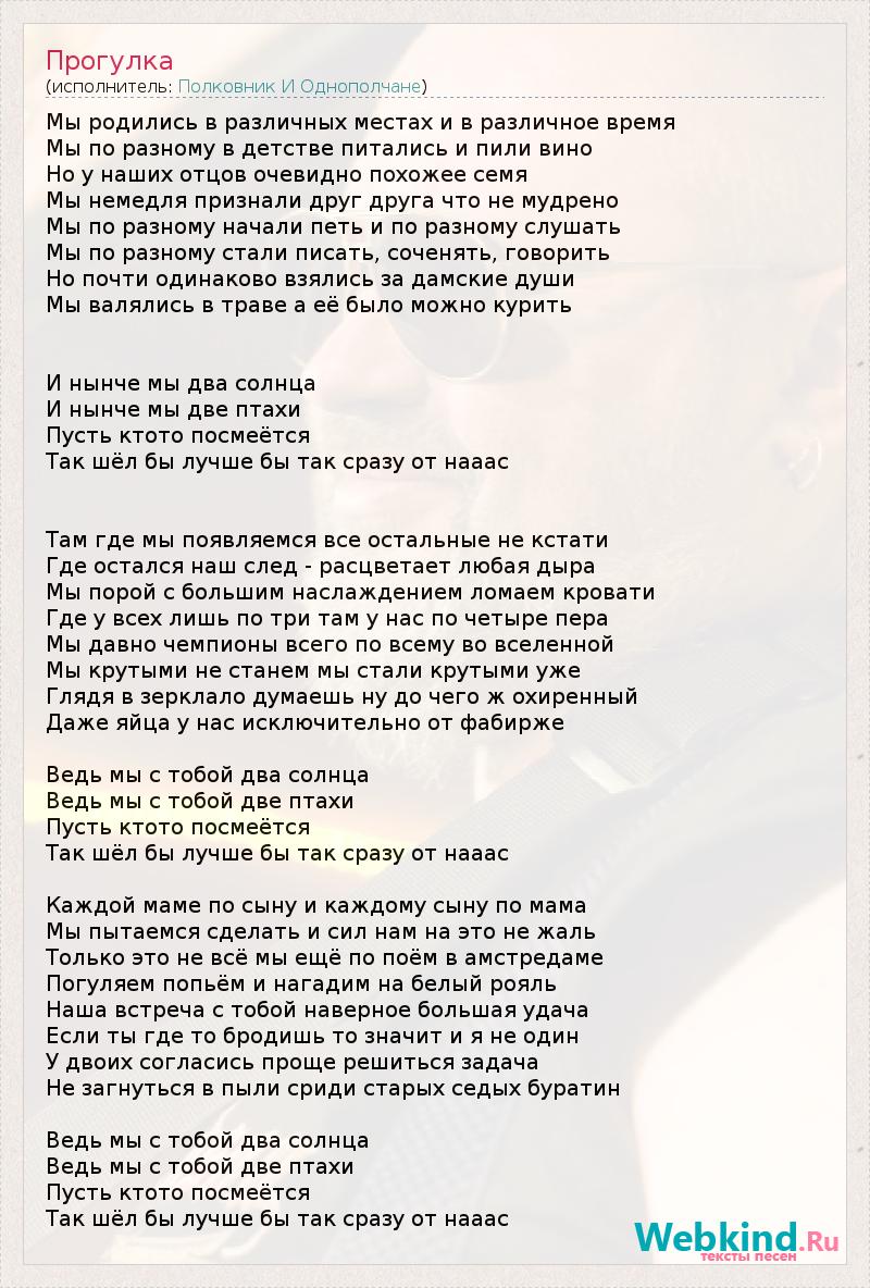 Мы родились в различных местах и в различное время Мы по разному в детстве питались и пили вино Но у наших отцов очевидно похожее семя Мы немедля признали друг друга что не мудрено Мы по разному начали петь и по разному слушать Мы по разному стали писать, соченять, говорить Но почти одинаково взялись за дамские души Мы валялись в траве а её было можно курить И нынче мы два солнца И нынче мы две птахи Пусть ктото посмеётся Так шёл бы лучше бы так сразу от нааас Там где мы появляемся все остальные не кстати Где остался наш след - расцветает любая дыра Мы порой с большим наслаждением ломаем кровати Где у всех лишь по три там у нас по четыре пера Мы давно чемпионы всего по всему во вселенной Мы крутыми не станем мы стали крутыми уже Глядя в зерклало думаешь ну до чего ж охиренный Даже яйца у нас исключительно от фабирже Ведь мы с тобой два солнца Ведь мы с тобой две птахи Пусть ктото посмеётся Так шёл бы лучше бы так сразу от нааас Каждой маме по сыну и каждому сыну по мама Мы пытаемся сделать и сил нам на это не жаль Только это не всё мы ещё по поём в амстредаме Погуляем попьём и нагадим на белый рояль Наша встреча с тобой наверное большая удача Если ты где то бродишь то значит и я не один У двоих согласись проще решиться задача Не загнуться в пыли сриди старых седых буратин Ведь мы с тобой два солнца Ведь мы с тобой две птахи Пусть ктото посмеётся Так шёл бы лучше бы так сразу от нааас