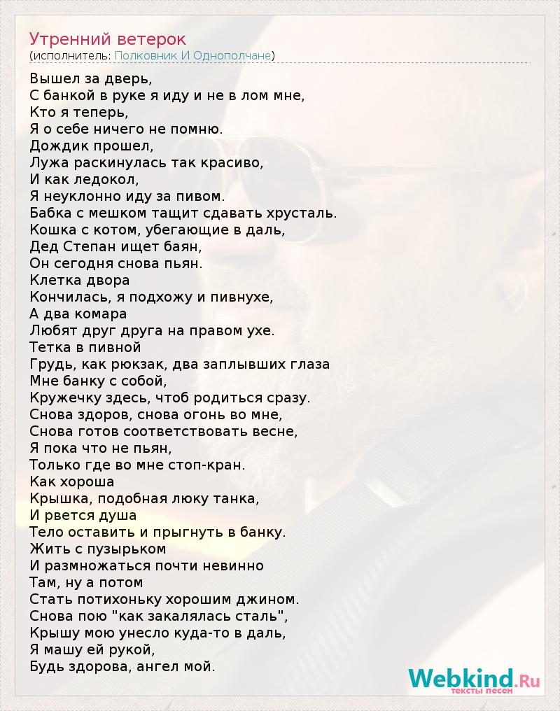 Вышел за дверь, С банкой в руке я иду и не в лом мне, Кто я теперь, Я о себе ничего не помню. Дождик прошел, Лужа раскинулась так красиво, И как ледокол, Я неуклонно иду за пивом. Бабка с мешком тащит сдавать хрусталь. Кошка с котом, убегающие в даль, Дед Степан ищет баян, Он сегодня снова пьян. Клетка двора Кончилась, я подхожу и пивнухе, А два комара Любят друг друга на правом ухе. Тетка в пивной Грудь, как рюкзак, два заплывших глаза Мне банку с собой, Кружечку здесь, чтоб родиться сразу. Снова здоров, снова огонь во мне, Снова готов соответствовать весне, Я пока что не пьян, Только где во мне стоп-кран. Как хороша Крышка, подобная люку танка, И рвется душа Тело оставить и прыгнуть в банку. Жить с пузырьком И размножаться почти невинно Там, ну а потом Стать потихоньку хорошим джином. Снова пою "как закалялась сталь", Крышу мою унесло куда-то в даль, Я машу ей рукой, Будь здорова, ангел мой.