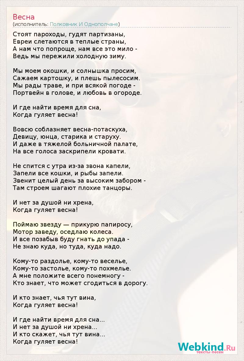 Стоят пароходы, гудят партизаны, Евреи слетаются в теплые страны, А нам что попроще, нам все это мило - Ведь мы пережили холодную зиму. Мы моем окошки, и солнышка просим, Сажаем картошку, и плешь пылесосим. Мы рады траве, и при всякой погоде - Портвейн в голове, и любовь в огороде. И где найти время для сна, Когда гуляет весна! Вовсю соблазняет весна-потаскуха, Девицу, юнца, старика и старуху. И даже в тяжелой больничной палате, На все голоса заскрипели кровати. Не спится с утра из-за звона капели, Запели все кошки, и рыбы запели. Звенит целый день за высоким забором - Там строем шагают плохие танцоры. И нет за душой ни хрена, Когда гуляет весна! Поймаю звезду — прикурю папиросу, Мотор заведу, оседлаю колеса. И все позабыв буду гнать до упада - Не знаю куда, но туда, куда надо. Кому-то раздолье, кому-то веселье, Кому-то застолье, кому-то похмелье. А мне положите всего понемногу - Кто знает, что может сгодиться в дорогу. И кто знает, чья тут вина, Когда гуляет весна! И где найти время для сна... И нет за душой ни хрена... И кто скажет, чья тут вина... Когда гуляет весна!