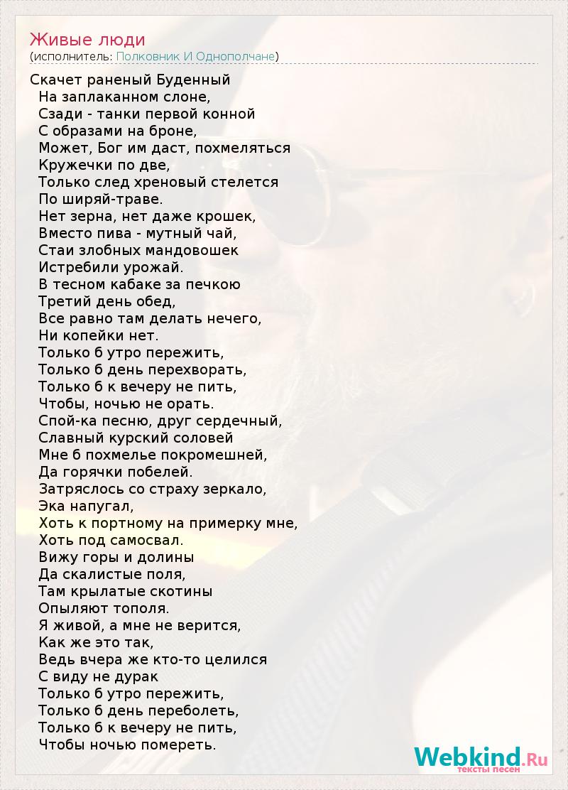 Скачет раненый Буденный На заплаканном слоне, Сзади - танки первой конной С образами на броне, Может, Бог им даст, похмеляться Кружечки по две, Только след хреновый стелется По ширяй-траве. Нет зерна, нет даже крошек, Вместо пива - мутный чай, Стаи злобных мандовошек Истребили урожай. В тесном кабаке за печкою Третий день обед, Все равно там делать нечего, Ни копейки нет. Только б утро пережить, Только б день перехворать, Только б к вечеру не пить, Чтобы, ночью не орать. Спой-ка песню, друг сердечный, Славный курский соловей Мне б похмелье покромешней, Да горячки побелей. Затряслось со страху зеркало, Эка напугал, Хоть к портному на примерку мне, Хоть под самосвал. Вижу горы и долины Да скалистые поля, Там крылатые скотины Опыляют тополя. Я живой, а мне не верится, Как же это так, Ведь вчера же кто-то целился С виду не дурак Только б утро пережить, Только б день переболеть, Только б к вечеру не пить, Чтобы ночью помереть.