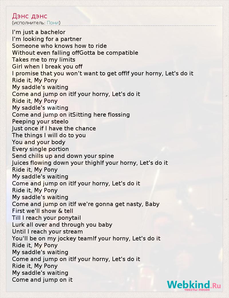 I'm just a bachelor I'm looking for a partner Someone who knows how to ride Without even falling offGotta be compatible Takes me to my limits Girl when I break you off I promise that you won't want to get offIf your horny, Let's do it Ride it, My Pony My saddle's waiting Come and jump on itIf your horny, Let's do it Ride it, My Pony My saddle's waiting Come and jump on itSitting here flossing Peeping your steelo Just once if I have the chance The things I will do to you You and your body Every single portion Send chills up and down your spine Juices flowing down your thighIf your horny, Let's do it Ride it, My Pony My saddle's waiting Come and jump on itIf your horny, Let's do it Ride it, My Pony My saddle's waiting Come and jump on itIf we're gonna get nasty, Baby First we'll show & tell Till I reach your ponytail Lurk all over and through you baby Until I reach your stream You'll be on my jockey teamIf your horny, Let's do it Ride it, My Pony My saddle's waiting Come and jump on itIf your horny, Let's do it Ride it, My Pony My saddle's waiting Come and jump on it