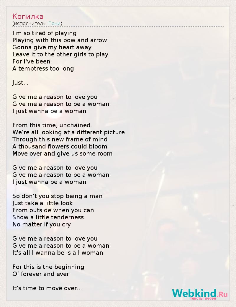 I'm so tired of playing Playing with this bow and arrow Gonna give my heart away Leave it to the other girls to play For I've been A temptress too long Just... Give me a reason to love you Give me a reason to be a woman I just wanna be a woman From this time, unchained We're all looking at a different picture Through this new frame of mind A thousand flowers could bloom Move over and give us some room Give me a reason to love you Give me a reason to be a woman I just wanna be a woman So don't you stop being a man Just take a little look From outside when you can Show a little tenderness No matter if you cry Give me a reason to love you Give me a reason to be a woman It's all I wanna be is all woman For this is the beginning Of forever and ever It's time to move over...