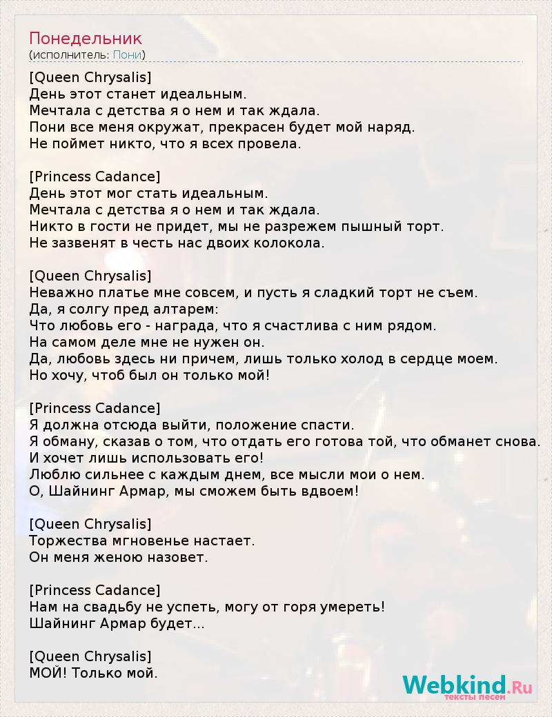 [Queen Chrysalis] День этот станет идеальным. Мечтала с детства я о нем и так ждала. Пони все меня окружат, прекрасен будет мой наряд. Не поймет никто, что я всех провела. [Princess Cadance] День этот мог стать идеальным. Мечтала с детства я о нем и так ждала. Никто в гости не придет, мы не разрежем пышный торт. Не зазвенят в честь нас двоих колокола. [Queen Chrysalis] Неважно платье мне совсем, и пусть я сладкий торт не съем. Да, я солгу пред алтарем: Что любовь его - награда, что я счастлива с ним рядом. На самом деле мне не нужен он. Да, любовь здесь ни причем, лишь только холод в сердце моем. Но хочу, чтоб был он только мой! [Princess Cadance] Я должна отсюда выйти, положение спасти. Я обману, сказав о том, что отдать его готова той, что обманет снова. И хочет лишь использовать его! Люблю сильнее с каждым днем, все мысли мои о нем. О, Шайнинг Армар, мы сможем быть вдвоем! [Queen Chrysalis] Торжества мгновенье настает. Он меня женою назовет. [Princess Cadance] Нам на свадьбу не успеть, могу от горя умереть! Шайнинг Армар будет... [Queen Chrysalis] МОЙ! Только мой.