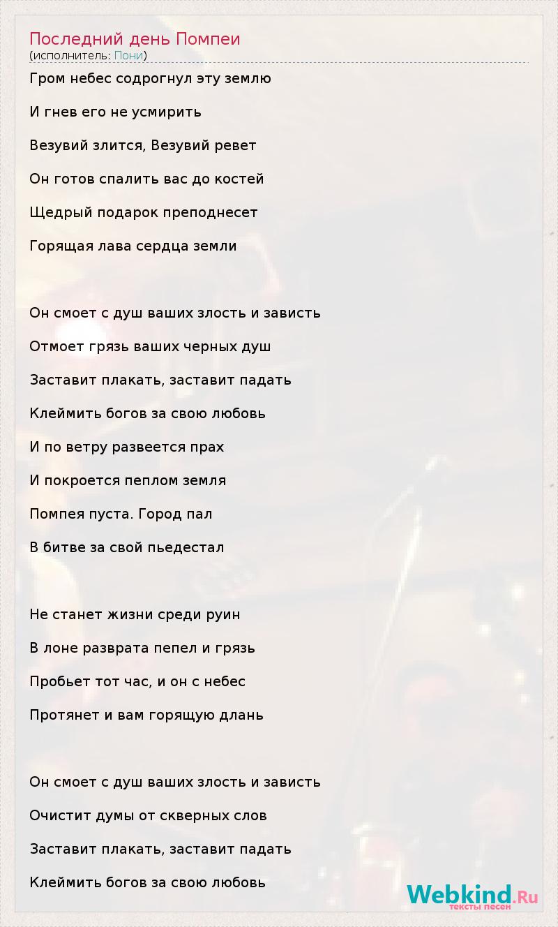 Гром небес содрогнул эту землю И гнев его не усмирить Везувий злится, Везувий ревет Он готов спалить вас до костей Щедрый подарок преподнесет Горящая лава сердца земли Он смоет с душ ваших злость и зависть Отмоет грязь ваших черных душ Заставит плакать, заставит падать Клеймить богов за свою любовь И по ветру развеется прах И покроется пеплом земля Помпея пуста. Город пал В битве за свой пьедестал Не станет жизни среди руин В лоне разврата пепел и грязь Пробьет тот час, и он с небес Протянет и вам горящую длань Он смоет с душ ваших злость и зависть Очистит думы от скверных слов Заставит плакать, заставит падать Клеймить богов за свою любовь