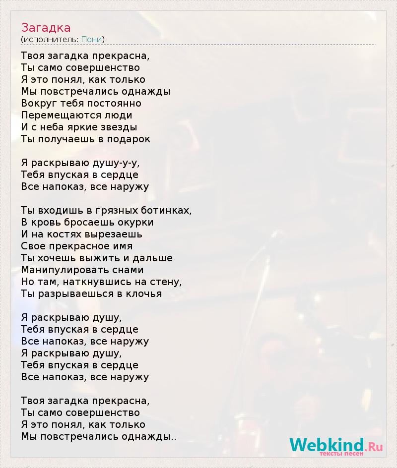 Твоя загадка прекрасна, Ты само совершенство Я это понял, как только Мы повстречались однажды Вокруг тебя постоянно Перемещаются люди И с неба яркие звезды Ты получаешь в подарок Я раскрываю душу-у-у, Тебя впуская в сердце Все напоказ, все наружу Ты входишь в грязных ботинках, В кровь бросаешь окурки И на костях вырезаешь Свое прекрасное имя Ты хочешь выжить и дальше Манипулировать снами Но там, наткнувшись на стену, Ты разрываешься в клочья Я раскрываю душу, Тебя впуская в сердце Все напоказ, все наружу Я раскрываю душу, Тебя впуская в сердце Все напоказ, все наружу Твоя загадка прекрасна, Ты само совершенство Я это понял, как только Мы повстречались однажды..