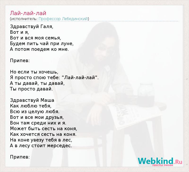Здравствуй Галя, Вот и я, Вот и вся моя семья, Будем пить чай при луне, А потом поедем ко мне. Припев: Но если ты хочешь, Я просто спою тебе: "Лай-лай-лай". А ты давай, ты давай, Ты просто давай. Здравствуй Маша Как люблю тебя, Всю из целую любя. Вот и все мои друзья, Вон там среди них и я. Может быть сесть на коня, Как хочется сесть на коня. На коне увезу тебя в лес, А в лесу стоит мерседес. Припев: