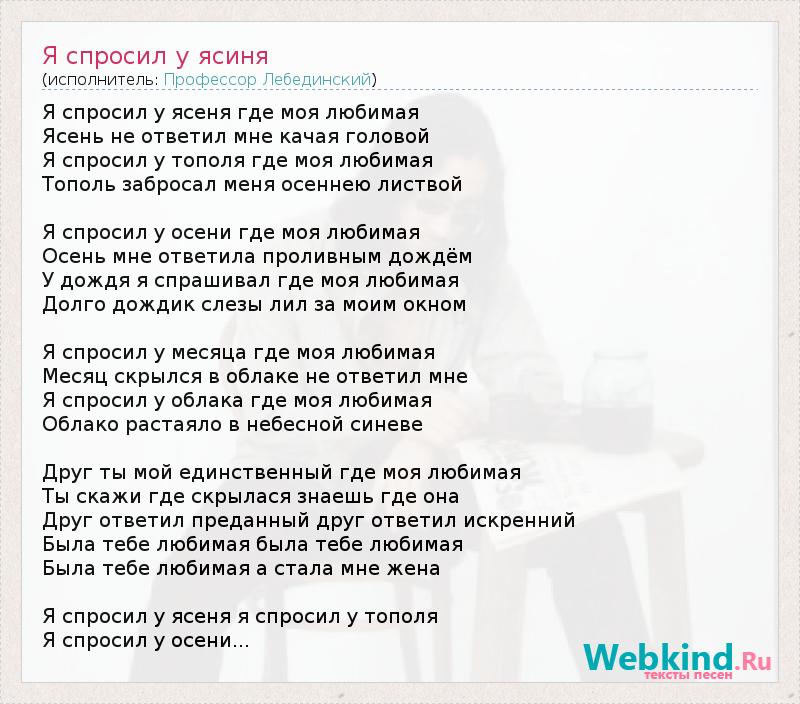 Я спросил у ясеня где моя любимая Ясень не ответил мне качая головой Я спросил у тополя где моя любимая Тополь забросал меня осеннею листвой Я спросил у осени где моя любимая Осень мне ответила проливным дождём У дождя я спрашивал где моя любимая Долго дождик слезы лил за моим окном Я спросил у месяца где моя любимая Месяц скрылся в облаке не ответил мне Я спросил у облака где моя любимая Облако растаяло в небесной синеве Друг ты мой единственный где моя любимая Ты скажи где скрылася знаешь где она Друг ответил преданный друг ответил искренний Была тебе любимая была тебе любимая Была тебе любимая а стала мне жена Я спросил у ясеня я спросил у тополя Я спросил у осени...