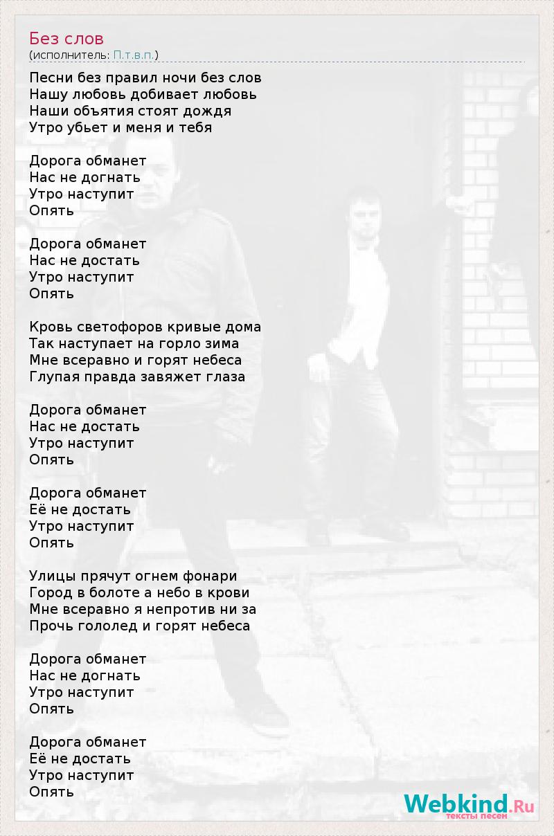 Песни без правил ночи без слов Нашу любовь добивает любовь Наши объятия стоят дождя Утро убьет и меня и тебя Дорога обманет Нас не догнать Утро наступит Опять Дорога обманет Нас не достать Утро наступит Опять Кровь светофоров кривые дома Так наступает на горло зима Мне всеравно и горят небеса Глупая правда завяжет глаза Дорога обманет Нас не достать Утро наступит Опять Дорога обманет Её не достать Утро наступит Опять Улицы прячут огнем фонари Город в болоте а небо в крови Мне всеравно я непротив ни за Прочь гололед и горят небеса Дорога обманет Нас не догнать Утро наступит Опять Дорога обманет Её не достать Утро наступит Опять