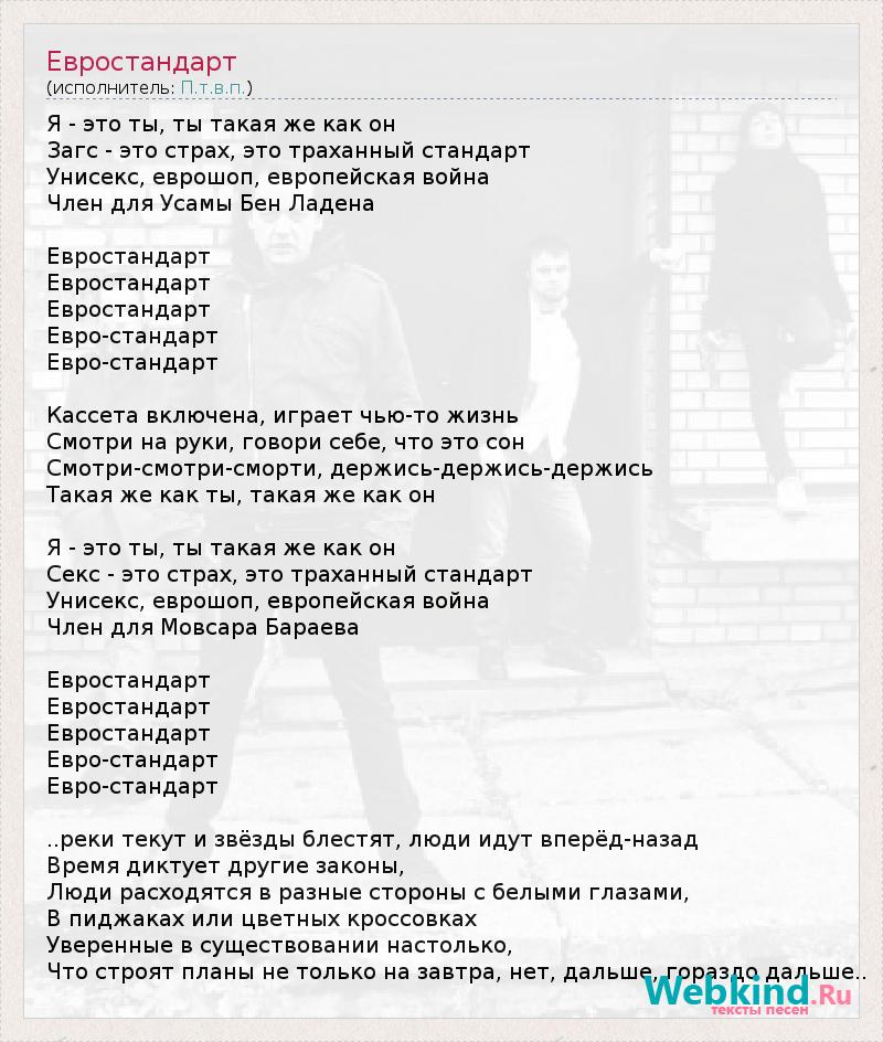 Я - это ты, ты такая же как он Загс - это страх, это траханный стандарт Унисекс, еврошоп, европейская война Член для Усамы Бен Ладена Евростандарт Евростандарт Евростандарт Евро-стандарт Евро-стандарт Кассета включена, играет чью-то жизнь Смотри на руки, говори себе, что это сон Смотри-смотри-сморти, держись-держись-держись Такая же как ты, такая же как он Я - это ты, ты такая же как он Секс - это страх, это траханный стандарт Унисекс, еврошоп, европейская война Член для Мовсара Бараева Евростандарт Евростандарт Евростандарт Евро-стандарт Евро-стандарт ..реки текут и звёзды блестят, люди идут вперёд-назад Время диктует другие законы, Люди расходятся в разные стороны с белыми глазами, В пиджаках или цветных кроссовках Уверенные в существовании настолько, Что строят планы не только на завтра, нет, дальше, гораздо дальше..