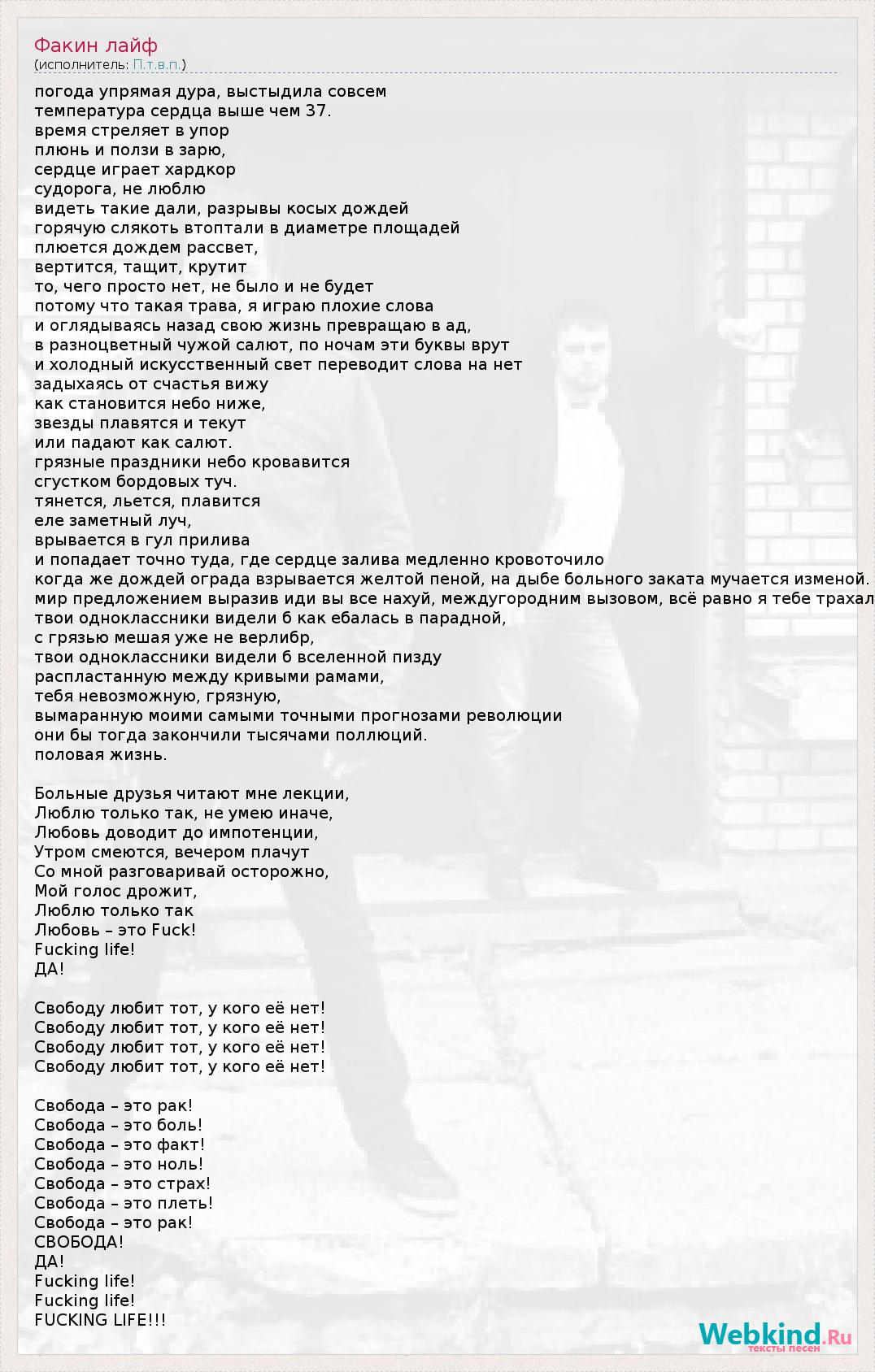 погода упрямая дура, выстыдила совсем температура сердца выше чем 37. время стреляет в упор плюнь и ползи в зарю, сердце играет хардкор судорога, не люблю видеть такие дали, разрывы косых дождей горячую слякоть втоптали в диаметре площадей плюется дождем рассвет, вертится, тащит, крутит то, чего просто нет, не было и не будет потому что такая трава, я играю плохие слова и оглядываясь назад свою жизнь превращаю в ад, в разноцветный чужой салют, по ночам эти буквы врут и холодный искусственный свет переводит слова на нет задыхаясь от счастья вижу как становится небо ниже, звезды плавятся и текут или падают как салют. грязные праздники небо кровавится сгустком бордовых туч. тянется, льется, плавится еле заметный луч, врывается в гул прилива и попадает точно туда, где сердце залива медленно кровоточило когда же дождей ограда взрывается желтой пеной, на дыбе больного заката мучается изменой. мир предложением выразив иди вы все нахуй, междугородним вызовом, всё равно я тебе трахал твои одноклассники видели б как ебалась в парадной, с грязью мешая уже не верлибр, твои одноклассники видели б вселенной пизду распластанную между кривыми рамами, тебя невозможную, грязную, вымаранную моими самыми точными прогнозами революции они бы тогда закончили тысячами поллюций. половая жизнь. Больные друзья читают мне лекции, Люблю только так, не умею иначе, Любовь доводит до импотенции, Утром смеются, вечером плачут Со мной разговаривай осторожно, Мой голос дрожит, Люблю только так Любовь – это Fuck! Fucking life! ДА! Свободу любит тот, у кого её нет! Свободу любит тот, у кого её нет! Свободу любит тот, у кого её нет! Свободу любит тот, у кого её нет! Свобода – это рак! Свобода – это боль! Свобода – это факт! Свобода – это ноль! Свобода – это страх! Свобода – это плеть! Свобода – это рак! СВОБОДА! ДА! Fucking life! Fucking life! FUCKING LIFE!!!
