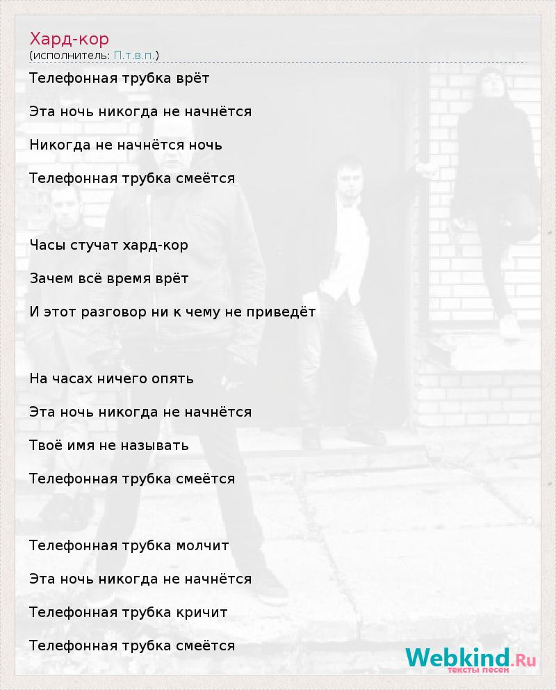 Телефонная трубка врёт Эта ночь никогда не начнётся Никогда не начнётся ночь Телефонная трубка смеётся Часы стучат хард-кор Зачем всё время врёт И этот разговор ни к чему не приведёт На часах ничего опять Эта ночь никогда не начнётся Твоё имя не называть Телефонная трубка смеётся Телефонная трубка молчит Эта ночь никогда не начнётся Телефонная трубка кричит Телефонная трубка смеётся