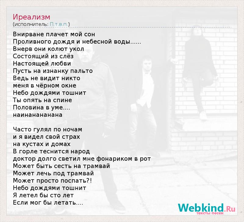 Внирване плачет мой сон Проливного дождя и небесной воды...... Внерв они колют укол Состоящий из слёз Настоящей любви Пусть на изнанку пальто Ведь не видит никто меня в чёрном окне Небо дождями тошнит Ты опять на спине Половина в уме.... наинанананана Часто гулял по ночам и я видел свой страх на кустах и домах В горле теснится народ доктор долго светил мне фонариком в рот Может быть сесть на трамвай Может лечь под трамвай Может просто поспать?! Небо дождями тошнит Я летел бы сто лет Если мог бы летать....