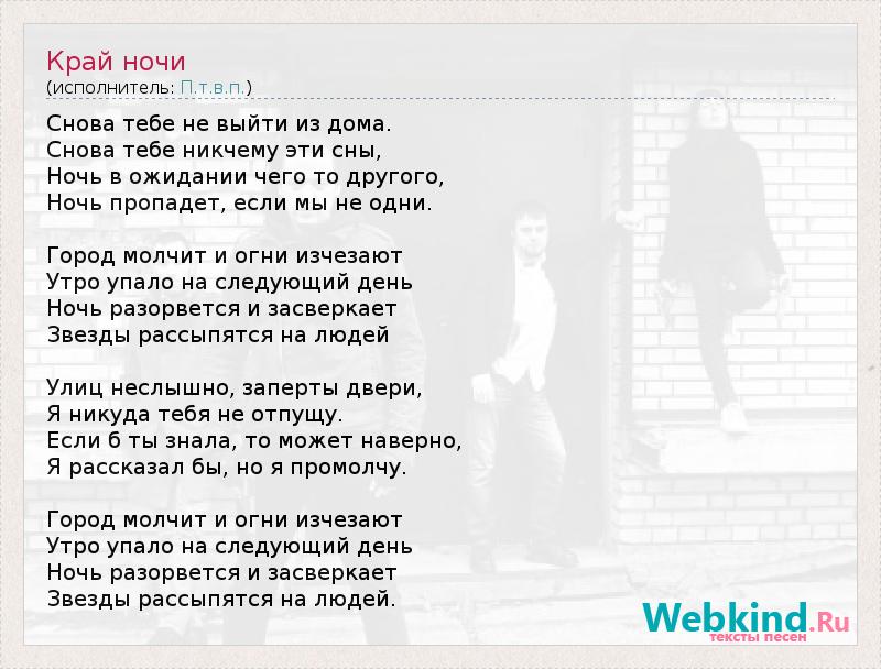 Снова тебе не выйти из дома. Снова тебе никчему эти сны, Ночь в ожидании чего то другого, Ночь пропадет, если мы не одни. Город молчит и огни изчезают Утро упало на следующий день Ночь разорвется и засверкает Звезды рассыпятся на людей Улиц неслышно, заперты двери, Я никуда тебя не отпущу. Если б ты знала, то может наверно, Я рассказал бы, но я промолчу. Город молчит и огни изчезают Утро упало на следующий день Ночь разорвется и засверкает Звезды рассыпятся на людей.