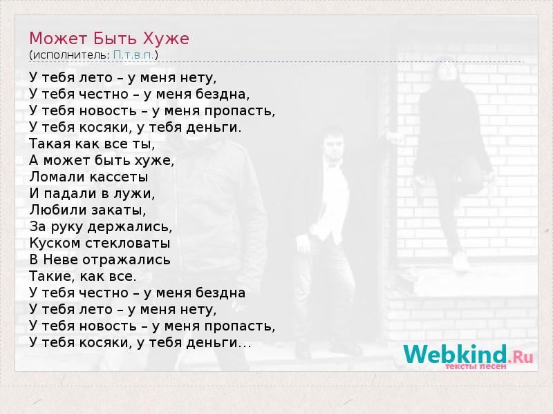 У тебя лето – у меня нету, У тебя честно – у меня бездна, У тебя новость – у меня пропасть, У тебя косяки, у тебя деньги. Такая как все ты, А может быть хуже, Ломали кассеты И падали в лужи, Любили закаты, За руку держались, Куском стекловаты В Неве отражались Такие, как все. У тебя честно – у меня бездна У тебя лето – у меня нету, У тебя новость – у меня пропасть, У тебя косяки, у тебя деньги…
