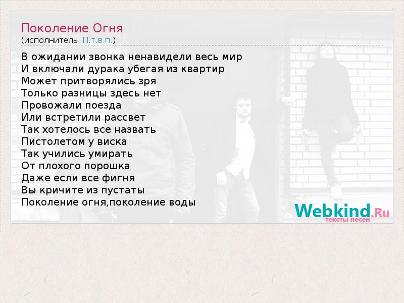 В ожидании звонка ненавидели весь мир И включали дурака убегая из квартир Может притворялись зря Только разницы здесь нет Провожали поезда Или встретили рассвет Так хотелось все назвать Пистолетом у виска Так учились умирать От плохого порошка Даже если все фигня Вы кричите из пустаты Поколение огня,поколение воды