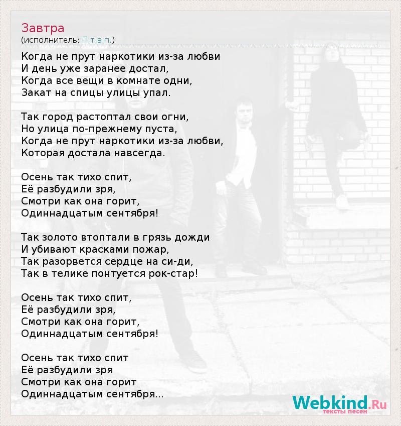 Когда не прут наркотики из-за любви И день уже заранее достал, Когда все вещи в комнате одни, Закат на спицы улицы упал. Так город растоптал свои огни, Но улица по-прежнему пуста, Когда не прут наркотики из-за любви, Которая достала навсегда. Осень так тихо спит, Её разбудили зря, Смотри как она горит, Одиннадцатым сентября! Так золото втоптали в грязь дожди И убивают красками пожар, Так разорвется сердце на си-ди, Так в телике понтуется рок-стар! Осень так тихо спит, Её разбудили зря, Смотри как она горит, Одиннадцатым сентября! Осень так тихо спит Её разбудили зря Смотри как она горит Одиннадцатым сентября...