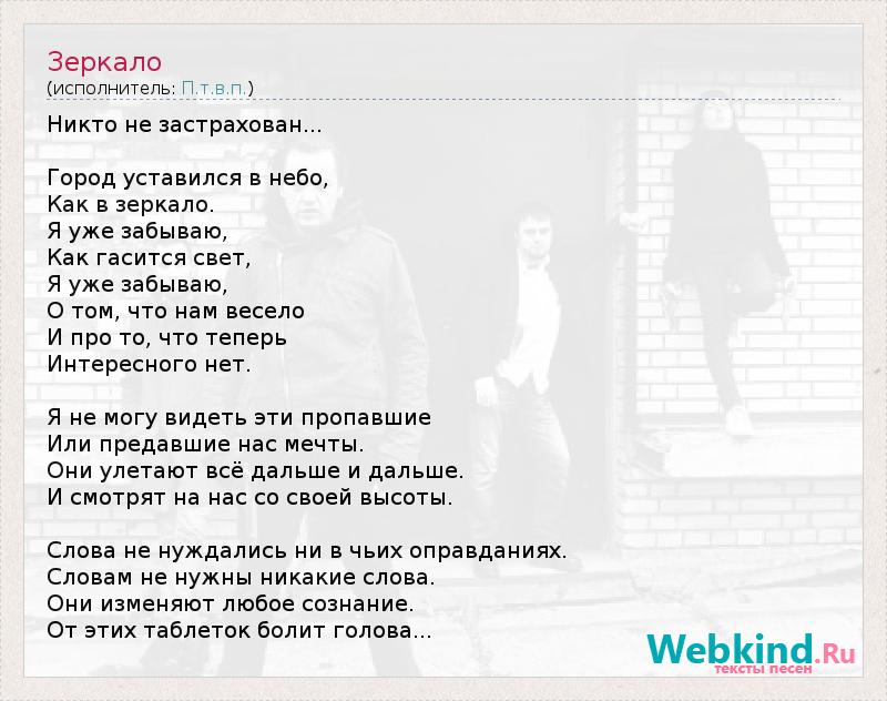 Никто не застрахован... Город уставился в небо, Как в зеркало. Я уже забываю, Как гасится свет, Я уже забываю, О том, что нам весело И про то, что теперь Интересного нет. Я не могу видеть эти пропавшие Или предавшие нас мечты. Они улетают всё дальше и дальше. И смотрят на нас со своей высоты. Слова не нуждались ни в чьих оправданиях. Словам не нужны никакие слова. Они изменяют любое сознание. От этих таблеток болит голова...