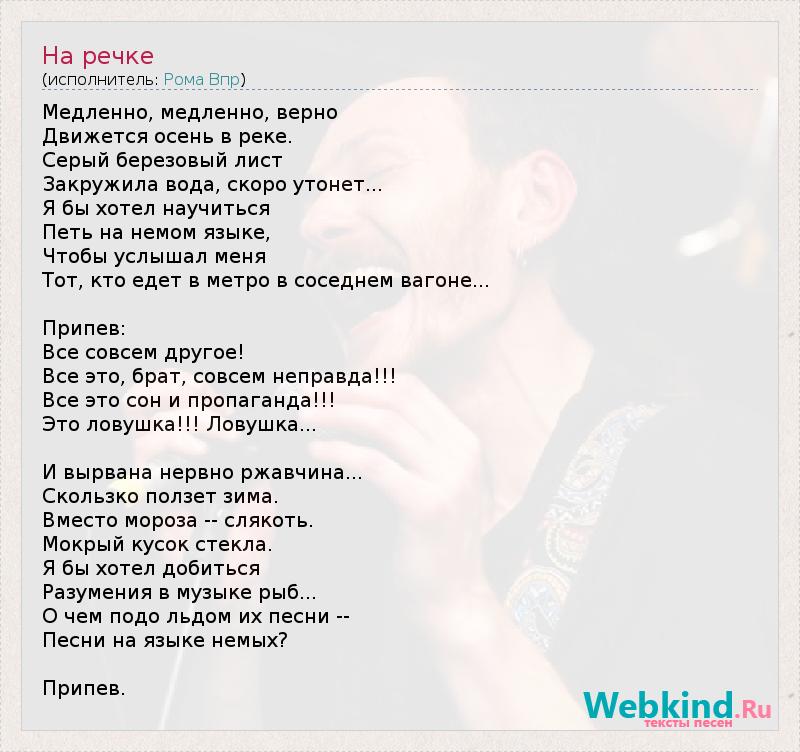 Медленно, медленно, верно Движется осень в реке. Серый березовый лист Закружила вода, скоро утонет... Я бы хотел научиться Петь на немом языке, Чтобы услышал меня Тот, кто едет в метро в соседнем вагоне... Припев: Все совсем другое! Все это, брат, совсем неправда!!! Все это сон и пропаганда!!! Это ловушка!!! Ловушка... И вырвана нервно ржавчина... Скользко ползет зима. Вместо мороза -- слякоть. Мокрый кусок стекла. Я бы хотел добиться Разумения в музыке рыб... О чем подо льдом их песни -- Песни на языке немых? Припев.