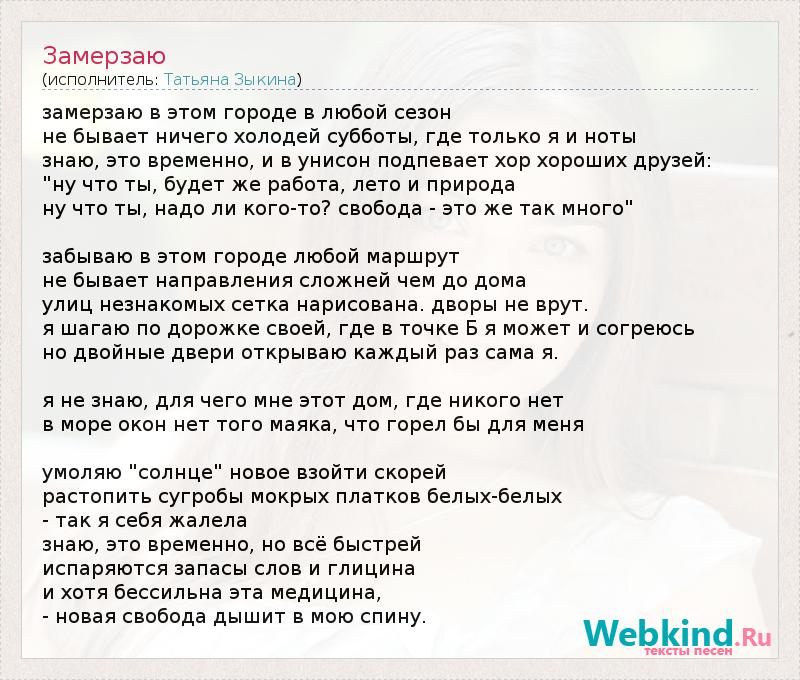 замерзаю в этом городе в любой сезон не бывает ничего холодей субботы, где только я и ноты знаю, это временно, и в унисон подпевает хор хороших друзей: "ну что ты, будет же работа, лето и природа ну что ты, надо ли кого-то? свобода - это же так много" забываю в этом городе любой маршрут не бывает направления сложней чем до дома улиц незнакомых сетка нарисована. дворы не врут. я шагаю по дорожке своей, где в точке Б я может и согреюсь но двойные двери открываю каждый раз сама я. я не знаю, для чего мне этот дом, где никого нет в море окон нет того маяка, что горел бы для меня умоляю "солнце" новое взойти скорей растопить сугробы мокрых платков белых-белых - так я себя жалела знаю, это временно, но всё быстрей испаряются запасы слов и глицина и хотя бессильна эта медицина, - новая свобода дышит в мою спину.