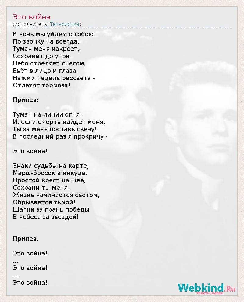 В ночь мы уйдем с тобою По звонку на всегда. Туман меня накроет, Сохранит до утра. Небо стреляет снегом, Бьёт в лицо и глаза. Нажми педаль рассвета - Отлетят тормоза! Припев: Туман на линии огня! И, если смерть найдет меня, Ты за меня поставь свечу! В последний раз я прокричу - Это война! Знаки судьбы на карте, Марш-бросок в никуда. Простой крест на шее, Сохрани ты меня! Жизнь начинается светом, Обрывается тьмой! Шагни за грань победы В небеса за звездой! Припев. Это война! ... Это война! ... Это война!
