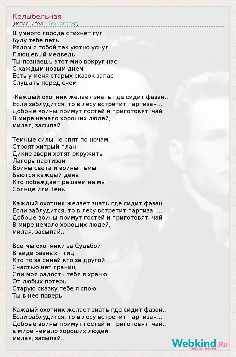 Шумного города стихнет гул Буду тебе петь Рядом с тобой так уютно уснул Плюшевый медведь Ты познаешь этот мир вокруг нас С каждым новым днем Есть у меня старых сказок запас Слушать перед сном -Каждый охотник желает знать где сидит фазан... Если заблудится, то в лесу встретит партизан... Добрые воины примут гостей и приготовят чай В мире немало хороших людей, милая, засыпай.. Темные силы не спят по ночам Строят хитрый план Дикие звери хотят окружить Лагерь партизан Воины света и воины тьмы Бьются каждый день Кто побеждает решаем не мы Солнце или Тень Каждый охотник желает знать где сидит фазан... Если заблудится, то в лесу встретит партизан... Добрые воины примут гостей и приготовят чай В мире немало хороших людей, милая, засыпай.. Все мы охотники за Судьбой В виде разных птиц Кто то за синей кто за другой Счастью нет границ Спи моя радость тебя я храню От любых потерь Старую сказку тебе я спою Ты в нее поверь Каждый охотник желает знать где сидит фазан... Если заблудится, то в лесу встретит партизан... Добрые воины примут гостей и приготовят чай.. в мире немало хороших людей, милая, засыпай..