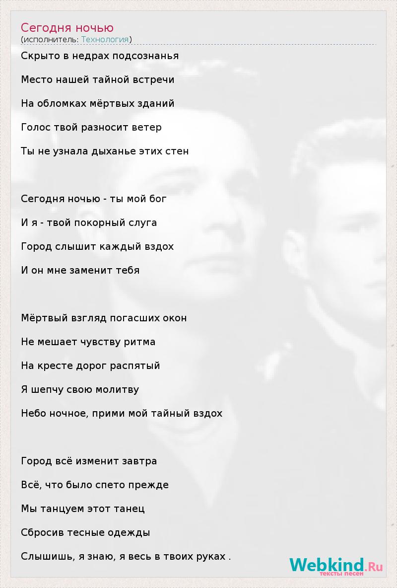 Скрыто в недрах подсознанья Место нашей тайной встречи На обломках мёртвых зданий Голос твой разносит ветер Ты не узнала дыханье этих стен Сегодня ночью - ты мой бог И я - твой покорный слуга Город слышит каждый вздох И он мне заменит тебя Мёртвый взгляд погасших окон Не мешает чувству ритма На кресте дорог распятый Я шепчу свою молитву Небо ночное, прими мой тайный вздох Город всё изменит завтра Всё, что было спето прежде Мы танцуем этот танец Сбросив тесные одежды Слышишь, я знаю, я весь в твоих руках .