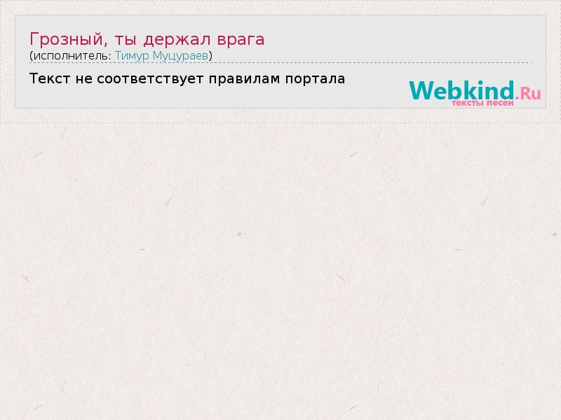 Bright stars shine in the blink of the moon, Somewhere people dream , see peaceful dreams And looming over Grozny with fumes gray haze , Terrible, violent squall of the raging war . Rockets fly here in the alleys , cross - Bullet suddenly to his temple - where a sniper sat down . Sharp whistling in the picket aircraft will fly , And recently, in the battle 's best friend was killed. Grozny, the flames of war , taking on himself, You 'll long to keep the enemy at bay . Here is the street suddenly slipped APCs , And booming echo ANC stitch . And day and night bombing , mortar - without end, Passerine replaced trill whistle lead. Young children - Chechens in combat You can not conquer nor fire , nor sword. Terrible , You held the enemy , Terrible , in a flame of fire , Terrible , and now you proud Proud as Your people . Terrible , You held the enemy , Terrible , in a flame of fire , Terrible , and now you proud Proud as Your people . Grief enough for all , for all will be held village to village , A lot of tears shed mothers to children . Many brothers did not return ever Terrible them under a buried his forever. Day and night, storm , storm Rescue Volley guns - it burns with fire . Scarlet colored snow January And everywhere were bodies of the enemy. Terrible , You held the enemy , Terrible , in a flame of fire , Terrible , and now you proud Proud as Your people . That frosty February, the entire city is surrounded , Ought we to go , breaking the ring , But how many guys do not have time to leave, There are many more nights in Grozny will be fights. City of shadows and darkness , blood and tears. How much misery , cruelty You moved ! City of death and stood in silence formidable . Let frustrated, but you did not get up on your knees ! Terrible , You held the enemy , Terrible , in a flame of fire , Terrible , and now you proud Proud as Your people ! Echo will go away war City that nurtured me. Terrible !