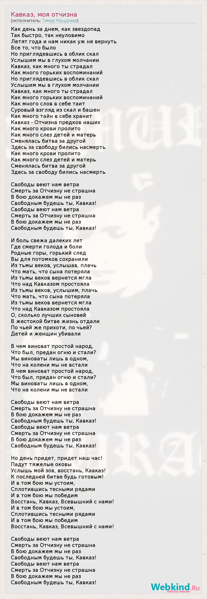 Как день за днем, как звездопад Так быстро, так неуловимо Летят года и нам никак уж не вернуть Все то, что было Но приглядевшись в облик скал Услышим мы в глухом молчании Кавказ, как много ты страдал Как много горьких воспоминаний Но приглядевшись в облик скал Услышим мы в глухом молчании Кавказ, как много ты страдал Как много горьких воспоминаний Как много слов в себе таит Суровый взгляд из скал и башен Как много тайн в себе хранит Кавказ - Отчизна предков наших Как много крови пролито Как много слез детей и матерь Сменялась битва за другой Здесь за свободу бились насмерть Как много крови пролито Как много слез детей и матерь Сменялась битва за другой Здесь за свободу бились насмерть Свободы веют нам ветра Смерть за Отчизну не страшна В бою докажем мы не раз Свободным будешь ты, Кавказ! Свободы веют нам ветра Смерть за Отчизну не страшна В бою докажем мы не раз Свободным будешь ты, Кавказ! И боль свежа далеких лет Где смерти голода и боли Родные горы, горький след Вы для потомков сохранили Из тьмы веков, услышав, плачь Что мать, что сына потеряла Из тьмы веков вернется мгла Что над Кавказом простояла Из тьмы веков, услышим, плачь Что мать, что сына потеряла Из тьмы веков вернется мгла Что над Кавказом простояла О, сколько лучших сыновей В жестокой битве жизнь отдали По чьей же прихоти, по чьей? Детей и женщин убивали В чем виноват простой народ, Что был, предан огню и стали? Мы виноваты лишь в одном, Что на колени мы не встали В чем виноват простой народ, Что был, предан огню и стали? Мы виноваты лишь в одном, Что на колени мы не встали Свободы веют нам ветра Смерть за Отчизну не страшна В бою докажем мы не раз Свободным будешь ты, Кавказ! Свободы веют нам ветра Смерть за Отчизну не страшна В бою докажем мы не раз Свободным будешь ты, Кавказ! Но день придет, придет наш час! Падут тяжелые оковы Услышь мой зов, восстань, Кавказ! К последней битве будь готовым! И в том бою мы устоим, Сплотившись тесными рядами И в том бою мы победим Восстань, Кавказ, Всевышний с нами! И в том бою мы устоим, Сплотившись тесными рядами И в том бою мы победим Восстань, Кавказ, Всевышний с нами! Свободы веют нам ветра Смерть за Отчизну не страшна В бою докажем мы не раз Свободным будешь ты, Кавказ! Свободы веют нам ветра Смерть за Отчизну не страшна В бою докажем мы не раз Свободным будешь ты, Кавказ!
