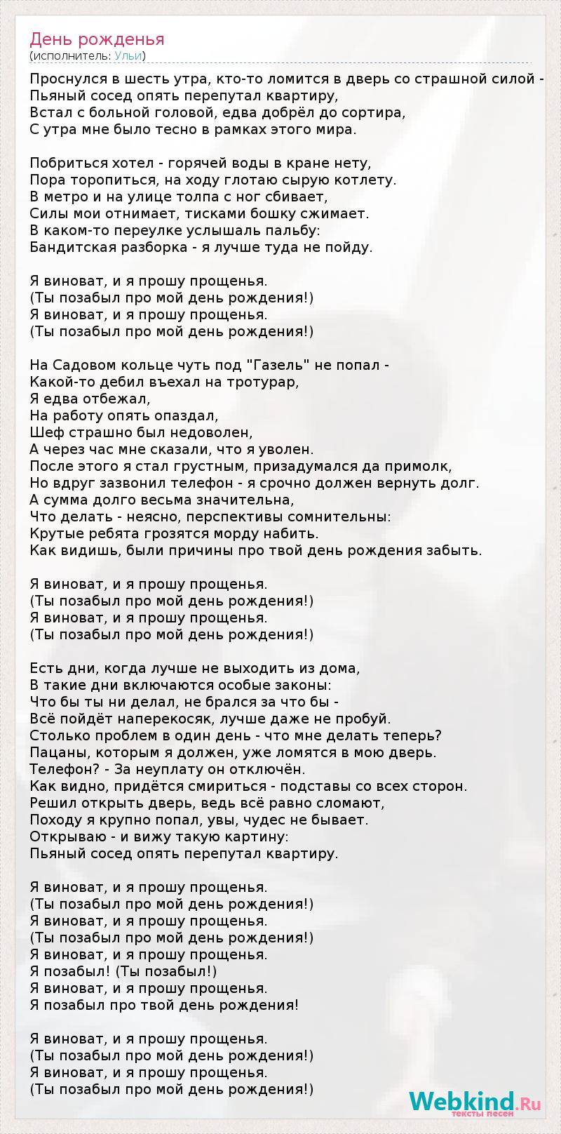 Проснулся в шесть утра, кто-то ломится в дверь со страшной силой - Пьяный сосед опять перепутал квартиру, Встал с больной головой, едва добрёл до сортира, С утра мне было тесно в рамках этого мира. Побриться хотел - горячей воды в кране нету, Пора торопиться, на ходу глотаю сырую котлету. В метро и на улице толпа с ног сбивает, Силы мои отнимает, тисками бошку сжимает. В каком-то переулке услышаль пальбу: Бандитская разборка - я лучше туда не пойду. Я виноват, и я прошу прощенья. (Ты позабыл про мой день рождения!) Я виноват, и я прошу прощенья. (Ты позабыл про мой день рождения!) На Садовом кольце чуть под "Газель" не попал - Какой-то дебил въехал на тротурар, Я едва отбежал, На работу опять опаздал, Шеф страшно был недоволен, А через час мне сказали, что я уволен. После этого я стал грустным, призадумался да примолк, Но вдруг зазвонил телефон - я срочно должен вернуть долг. А сумма долго весьма значительна, Что делать - неясно, перспективы сомнительны: Крутые ребята грозятся морду набить. Как видишь, были причины про твой день рождения забыть. Я виноват, и я прошу прощенья. (Ты позабыл про мой день рождения!) Я виноват, и я прошу прощенья. (Ты позабыл про мой день рождения!) Есть дни, когда лучше не выходить из дома, В такие дни включаются особые законы: Что бы ты ни делал, не брался за что бы - Всё пойдёт наперекосяк, лучше даже не пробуй. Столько проблем в один день - что мне делать теперь? Пацаны, которым я должен, уже ломятся в мою дверь. Телефон? - За неуплату он отключён. Как видно, придётся смириться - подставы со всех сторон. Решил открыть дверь, ведь всё равно сломают, Походу я крупно попал, увы, чудес не бывает. Открываю - и вижу такую картину: Пьяный сосед опять перепутал квартиру. Я виноват, и я прошу прощенья. (Ты позабыл про мой день рождения!) Я виноват, и я прошу прощенья. (Ты позабыл про мой день рождения!) Я виноват, и я прошу прощенья. Я позабыл! (Ты позабыл!) Я виноват, и я прошу прощенья. Я позабыл про твой день рождения! Я виноват, и я прошу прощенья. (Ты позабыл про мой день рождения!) Я виноват, и я прошу прощенья. (Ты позабыл про мой день рождения!)