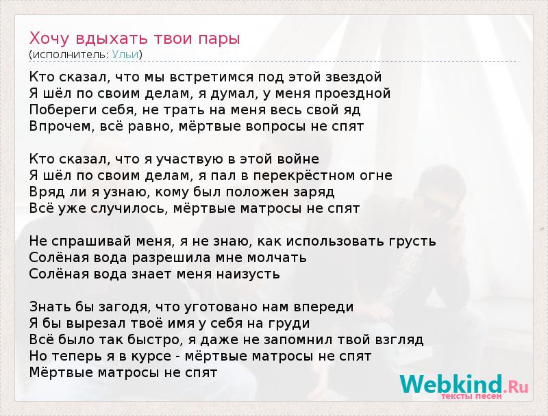 Кто сказал, что мы встретимся под этой звездой Я шёл по своим делам, я думал, у меня проездной Побереги себя, не трать на меня весь свой яд Впрочем, всё равно, мёртвые вопросы не спят Кто сказал, что я участвую в этой войне Я шёл по своим делам, я пал в перекрёстном огне Вряд ли я узнаю, кому был положен заряд Всё уже случилось, мёртвые матросы не спят Не спрашивай меня, я не знаю, как использовать грусть Солёная вода разрешила мне молчать Солёная вода знает меня наизусть Знать бы загодя, что уготовано нам впереди Я бы вырезал твоё имя у себя на груди Всё было так быстро, я даже не запомнил твой взгляд Но теперь я в курсе - мёртвые матросы не спят Мёртвые матросы не спят
