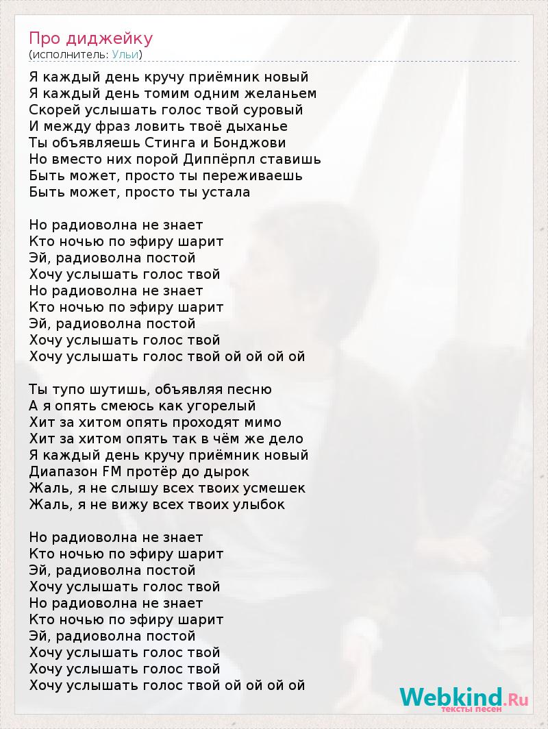 Я каждый день кручу приёмник новый Я каждый день томим одним желаньем Скорей услышать голос твой суровый И между фраз ловить твоё дыханье Ты объявляешь Стинга и Бонджови Но вместо них порой Диппёрпл ставишь Быть может, просто ты переживаешь Быть может, просто ты устала Но радиоволна не знает Кто ночью по эфиру шарит Эй, радиоволна постой Хочу услышать голос твой Но радиоволна не знает Кто ночью по эфиру шарит Эй, радиоволна постой Хочу услышать голос твой Хочу услышать голос твой ой ой ой ой Ты тупо шутишь, объявляя песню А я опять смеюсь как угорелый Хит за хитом опять проходят мимо Хит за хитом опять так в чём же дело Я каждый день кручу приёмник новый Диапазон FM протёр до дырок Жаль, я не слышу всех твоих усмешек Жаль, я не вижу всех твоих улыбок Но радиоволна не знает Кто ночью по эфиру шарит Эй, радиоволна постой Хочу услышать голос твой Но радиоволна не знает Кто ночью по эфиру шарит Эй, радиоволна постой Хочу услышать голос твой Хочу услышать голос твой Хочу услышать голос твой ой ой ой ой
