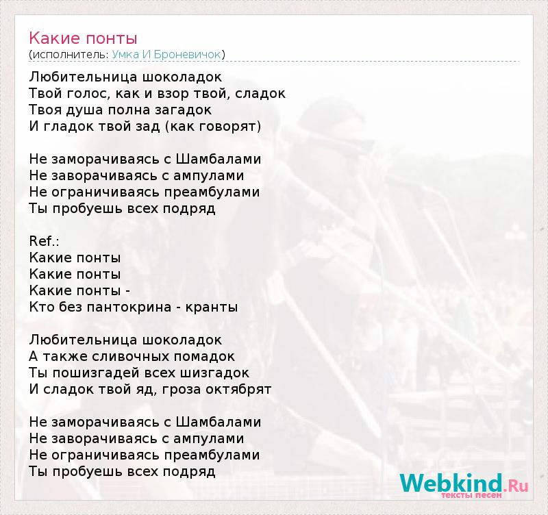 Любительница шоколадок Твой голос, как и взор твой, сладок Твоя душа полна загадок И гладок твой зад (как говорят) Не заморачиваясь с Шамбалами Не заворачиваясь с ампулами Не ограничиваясь преамбулами Ты пробуешь всех подряд Ref.: Какие понты Какие понты Какие понты - Кто без пантокрина - кранты Любительница шоколадок А также сливочных помадок Ты пошизгадей всех шизгадок И сладок твой яд, гроза октябрят Не заморачиваясь с Шамбалами Не заворачиваясь с ампулами Не ограничиваясь преамбулами Ты пробуешь всех подряд