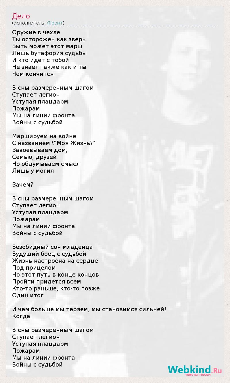 Оружие в чехле Ты осторожен как зверь Быть может этот марш Лишь бутафория судьбы И кто идет с тобой Не знает также как и ты Чем кончится В сны размеренным шагом Ступает легион Уступая плацдарм Пожарам Мы на линии фронта Войны с судьбой Маршируем на войне С названием \"Моя Жизнь\" Завоевываем дом, Семью, друзей Но обдумываем смысл Лишь у могил Зачем? В сны размеренным шагом Ступает легион Уступая плацдарм Пожарам Мы на линии фронта Войны с судьбой Безобидный сон младенца Будущий боец с судьбой Жизнь настроена на сердце Под прицелом Но этот путь в конце концов Пройти придется всем Кто-то раньше, кто-то позже Один итог И чем больше мы теряем, мы становимся сильней! Когда В сны размеренным шагом Ступает легион Уступая плацдарм Пожарам Мы на линии фронта Войны с судьбой