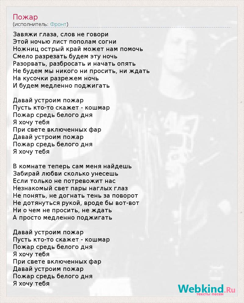 Завяжи глаза, слов не говори Этой ночью лист пополам согни Ножниц острый край может нам помочь Смело разрезать будем эту ночь Разорвать, разбросать и начать опять Не будем мы никого ни просить, ни ждать На кусочки разрежем ночь И будем медленно поджигать Давай устроим пожар Пусть кто-то скажет - кошмар Пожар средь белого дня Я хочу тебя При свете включенных фар Давай устроим пожар Пожар средь белого дня Я хочу тебя В комнате теперь сам меня найдешь Забирай любви сколько унесешь Если только не потревожит нас Незнакомый свет пары наглых глаз Не понять, не догнать тень за поворот Не дотянуться рукой, вроде бы вот-вот Ни о чем не просить, не ждать А просто медленно поджигать Давай устроим пожар Пусть кто-то скажет - кошмар Пожар средь белого дня Я хочу тебя При свете включенных фар Давай устроим пожар Пожар средь белого дня Я хочу тебя