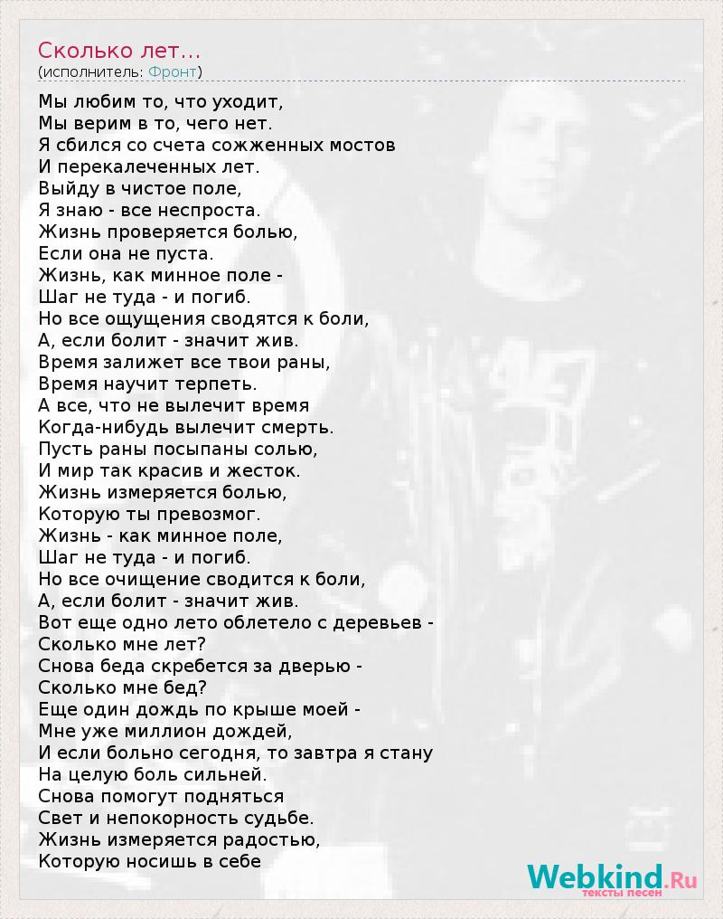 Мы любим то, что уходит, Мы верим в то, чего нет. Я сбился со счета сожженных мостов И перекалеченных лет. Выйду в чистое поле, Я знаю - все неспроста. Жизнь проверяется болью, Если она не пуста. Жизнь, как минное поле - Шаг не туда - и погиб. Но все ощущения сводятся к боли, А, если болит - значит жив. Время залижет все твои раны, Время научит терпеть. А все, что не вылечит время Когда-нибудь вылечит смерть. Пусть раны посыпаны солью, И мир так красив и жесток. Жизнь измеряется болью, Которую ты превозмог. Жизнь - как минное поле, Шаг не туда - и погиб. Но все очищение сводится к боли, А, если болит - значит жив. Вот еще одно лето облетело с деревьев - Сколько мне лет? Снова беда скребется за дверью - Сколько мне бед? Еще один дождь по крыше моей - Мне уже миллион дождей, И если больно сегодня, то завтра я стану На целую боль сильней. Снова помогут подняться Свет и непокорность судьбе. Жизнь измеряется радостью, Которую носишь в себе