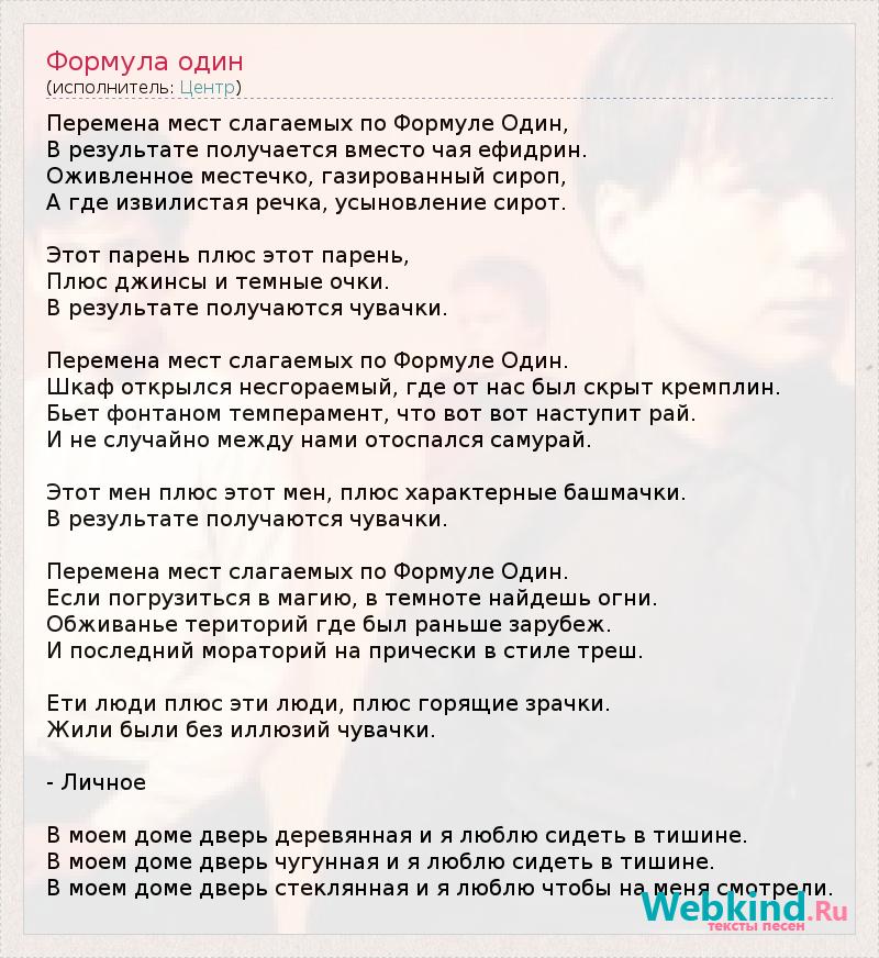Перемена мест слагаемых по Формуле Один, В результате получается вместо чая ефидрин. Оживленное местечко, газированный сироп, А где извилистая речка, усыновление сирот. Этот парень плюс этот парень, Плюс джинсы и темные очки. В результате получаются чувачки. Перемена мест слагаемых по Формуле Один. Шкаф открылся несгораемый, где от нас был скрыт кремплин. Бьет фонтаном темперамент, что вот вот наступит рай. И не случайно между нами отоспался самурай. Этот мен плюс этот мен, плюс характерные башмачки. В результате получаются чувачки. Перемена мест слагаемых по Формуле Один. Если погрузиться в магию, в темноте найдешь огни. Обживанье територий где был раньше зарубеж. И последний мораторий на прически в стиле треш. Ети люди плюс эти люди, плюс горящие зрачки. Жили были без иллюзий чувачки. - Личное В моем доме дверь деревянная и я люблю сидеть в тишине. В моем доме дверь чугунная и я люблю сидеть в тишине. В моем доме дверь стеклянная и я люблю чтобы на меня смотрели.