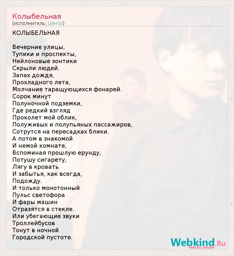 КОЛЫБЕЛЬНАЯ Вечерние улицы, Тупики и проспекты, Нейлоновые зонтики Скрыли людей. Запах дождя, Прохладного лета, Молчание таращующихся фонарей. Сорок минут Полуночной подземки, Где редкий взгляд Проколет мой облик, Полуживых и полупьяных пассажиров, Сотрутся на пересадках блики. А потом в знакомой И немой комнате, Вспоминая прошлую ерунду, Потушу сигарету, Лягу в кровать И забытья, как всегда, Подожду. И только монотонный Пульс светофора И фары машин Отразятся в стекле. Или убегающие звуки Троллейбусов Тонут в ночной Городской пустоте.